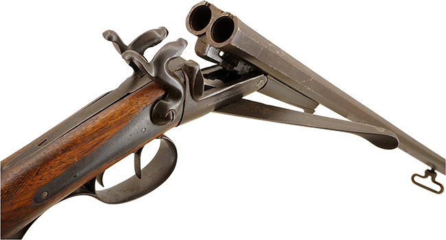 フリント・ロックからパーカッション・ロック、さらに米国以外のヨーロッパではピン・ファイア、そして最終的にセンター・ファイアへと撃発機構は発展してきましたが、基本的な構造は左右にサイド・ロックを備えた外観を保っています。 後装式では、装填時に薬室を開放する方法にいくつか違いが見られますが、基本的には銃身と本体前方下部にある爪がヒンジとして機能する中折れ式 (または元折れ式、ブレイク・アクション式) 構造を採用しています。 特に英国系をはじめとする多くの製品では、ブレイク・オープン式で開閉するロック・レバーが機関部後部上方の左右の撃鉄の間付近に設けられたトップ・レバー式が一般的です。 しかし、19世紀後期頃のヨーロッパ (大陸) 製品では、本体下方に開閉ロック・レバーを備えたアンダー・レバー式も見られます。 本品はドイツ製 (ヨーロッパ製) らしく、本体下部にロック・レバーを備えたアンダー・レバー式となっており、ロック・レバーを右方向に回転させる事で銃身が中折れ (ブレイク・オープン) します。 さらに、ブレイク・オープンした状態で、ロック・レバーと銃身の間に設けられたもう1本のレバーを左方向に回転させると、銃身と本体の連結が解かれ、銃身を取り外す事が可能になります。