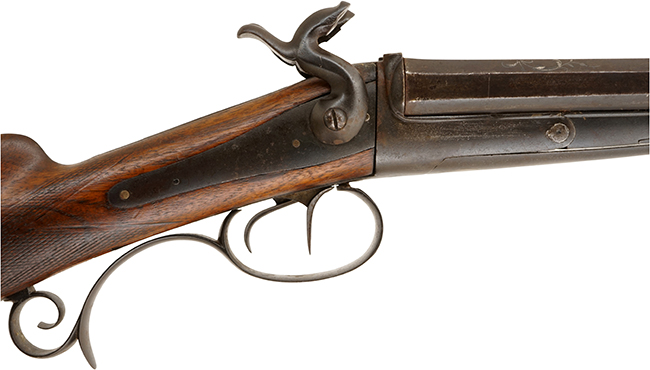 本品は銃身それぞれに対して外部に露出したハンマーを備えた有鶏頭式となっており、サイド・ロックはハンマーがロック・プレート最前部に配置された、「バック・アクション パーカッション ロック (Back-Action Percussion Lock)」と呼ばれる方式となっています。 このバック・アクション式は、ヨーロッパではポピュラーな方式でした。 フリント・ロックからパーカッション・ロックへの移行期 (1800年前期) には、当たり金 (フリズン) の名残から、ハンマーはサイド・ロック・プレートの比較的後方に配置されていました。 バック・アクション・ロックのハンマーは、ロック・プレートの最も前方に配置されており、鉄製のサイド・ロック・プレートが、木部に最も負担のかかるグリップ部分まで覆っていることから、補強の観点からも優れたデザインとなっていました。