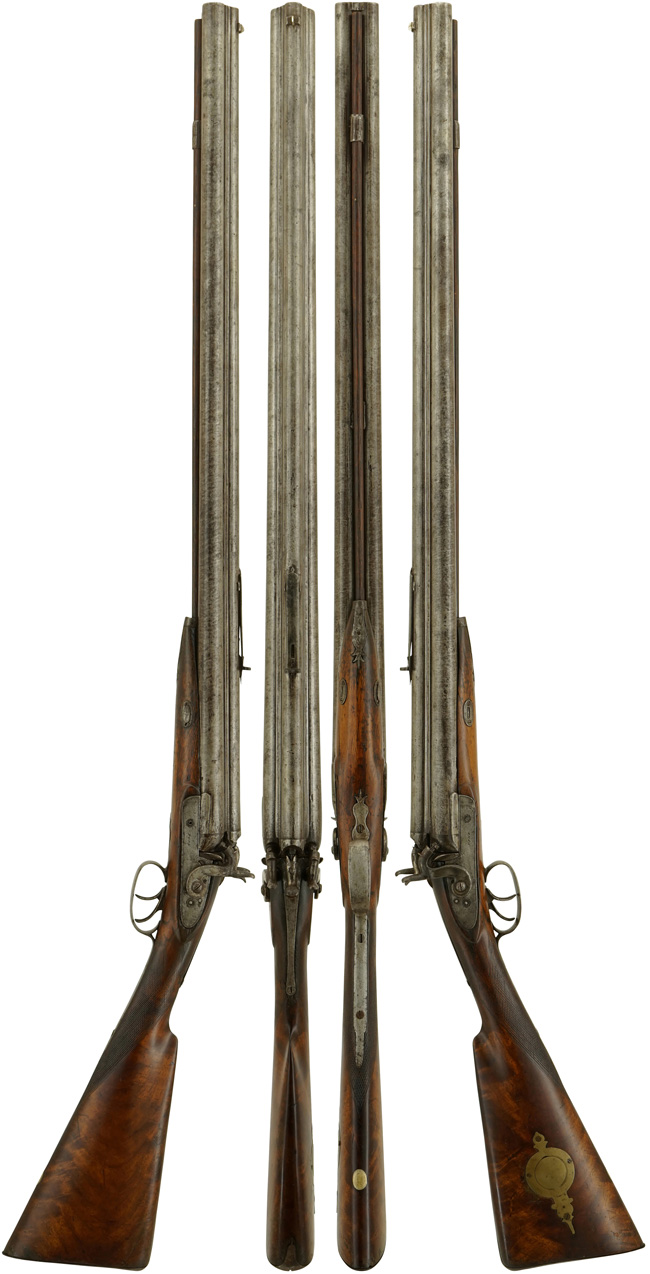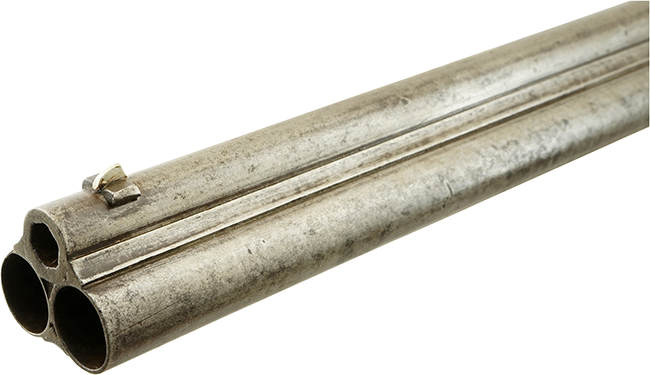 銃身は3本ともラウンド・バレルで、口径12GAの散弾銃用スムース・ボア銃身を水平に2本並べた上部に9,4mm (.37口径) の銃身を備えています。 上部の銃身は、内部にライフリング (施条) が施されたライフル銃身となっています。 このように、ライフルと散弾銃を組み合わせた銃器は、英語で一般的に「コンビネーション・ガン (Combination Gun)」と呼ばれ、銃身数に応じた名称が存在します。 水平二連式の場合は「ケープ・ガン (Cape Gun)」もしくはドイツ語で「ビュックスフリンテ (Buechsflinte)」と呼ばれ、本品のように銃身が3本のものはドイツ語で「三つ子」を意味する「ドリリング (Drilling)」、銃身が4本のものは「四つ子」を意味する「ヴィーアリング (Vierling)」、銃身が5本のものは「五つ子」を意味する「フンフリング (Fuenfling)」と呼ばれます。通常のDrillingはハンマーが内蔵されたセンター・ファイアですので、水平二連の散弾銃身の下にライフル銃身があります。 しかしながら、本品はそれらより古い管打式であるため、ライフル銃身が水平二連の散弾銃身の上に位置しており、ハンマーが3個(本)外部にあります。 この時代の品はライフル銃身用のハンマーがレシーバー下部にある「アンダー・ハンマー」になっており、3個目のハンマーが上にある品は海外のネットでも出てこない非常に珍しい品です。