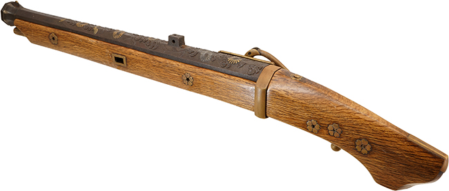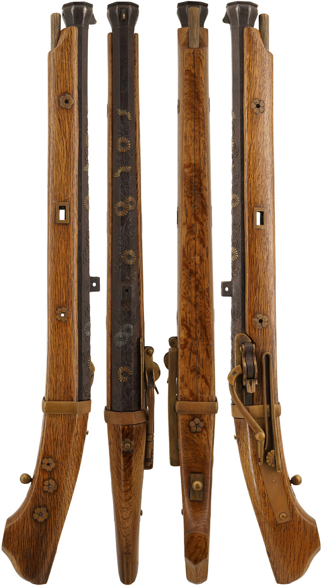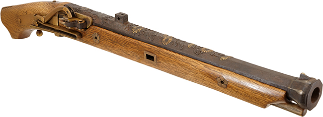 - 【火縄銃 堺四匁馬上筒 菊花葉文様高肉彫色絵象嵌 (在銘: 芝辻小兵衛清正作について】