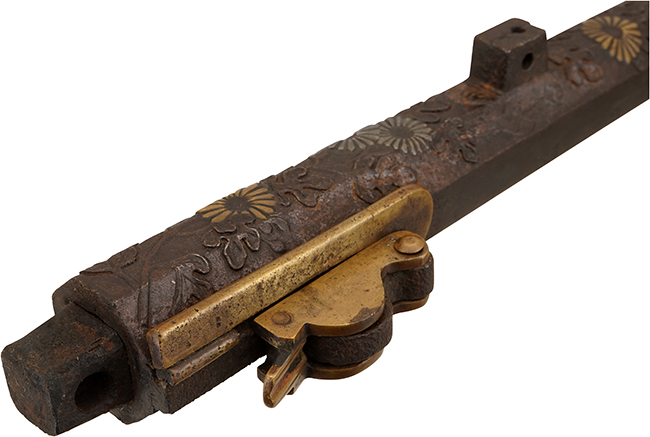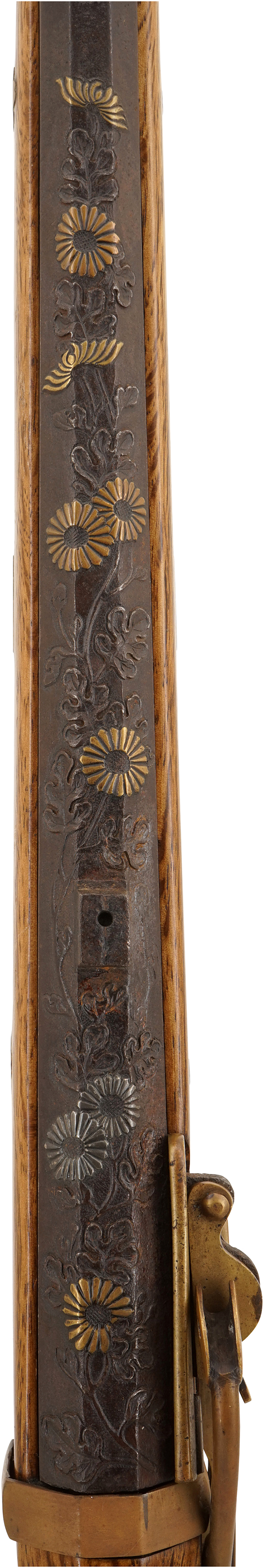 銃身の表面全体に一本の茎から何輪もの菊花と葉が出ている様子を描いた図柄は、咲き競う花が品位高く香る様子を正確に捉えた写実的肉彫で表した作品です。 鉄地に鋤彫りで菊花葉を彫り出し、敢えて葉は高く鋤きした部分を模様にして肉付け(肉彫)だけにし、菊花に銀と真鍮象嵌で変化を持たせて花が際立つように立体的に構成しています。 鋳造で出した「肉彫風」の模様とは全く異なります。上等の鍔を思い浮かべるような高度な技法は火縄銃の銃身には珍しくその装飾が大変魅力的です。