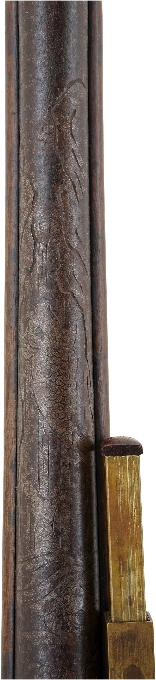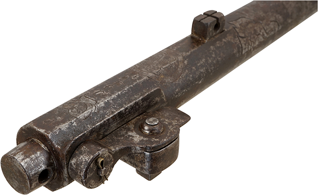 本品は全長が620mm(銃身長365mm)の両手で構える馬上筒(騎兵銃)タイプで、銃床左側面にはスライド式のサドル・リングが設けられています。 銃身は薬室と銃口付近が広がった丸銃身で、銃身上部には鯉ノ滝登リ図の彫りと葵紋、そして花押が入っています。 銃身は二箇所の目釘座によって銃床に取り付けられています。 口径が実測13mmですが装填をしやすいように銃口部がやや広がった(二重になった)丸柑子になっています。 先目当は杉形、元目当は千切透しとなっており、引き金は一般的なアールのついた三角形ですが、洋風の用心金の付いています。 (MM)