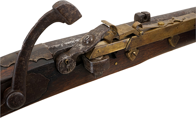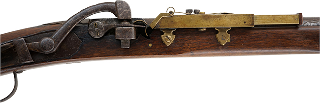 銃身右側面には特徴的な真鍮製の雷粒ケースが設けられており、ケース先端部分を後方に押し込む事により火蓋が開き、雷粒ケース内から雷粒が火皿に入る構造となっています。特殊な 火蓋はスプリングのテンションにより軽く閉じられる構造となっており、内部には撃針が設けられています。 発射時には撃鉄が火蓋の上面を叩くことによって火蓋内部の撃針が雷粒を撃発する構造となっています。 本銃には他にも迅速な連続射撃を行う為の工夫が随所に見られ、撃鉄は銃把右側面に設けられた板状のレバーを押し下げる事により、グリップから手を放す事なくコッキング操作を行う事が可能となっています。 また、銃口部は特殊な漏斗型となっており、弾薬を迅速に装填する事が可能となっている他、銃口先端下部には回転式の真鍮製かるか (さく杖) が取り付けられています。 かるかは先端を折り曲げてループさせる事により掴みやすい形状となっている他、 蝶番によって銃身先端部に固定されており、馬上等で使用する際の紛失を防いでいるものと思われます。