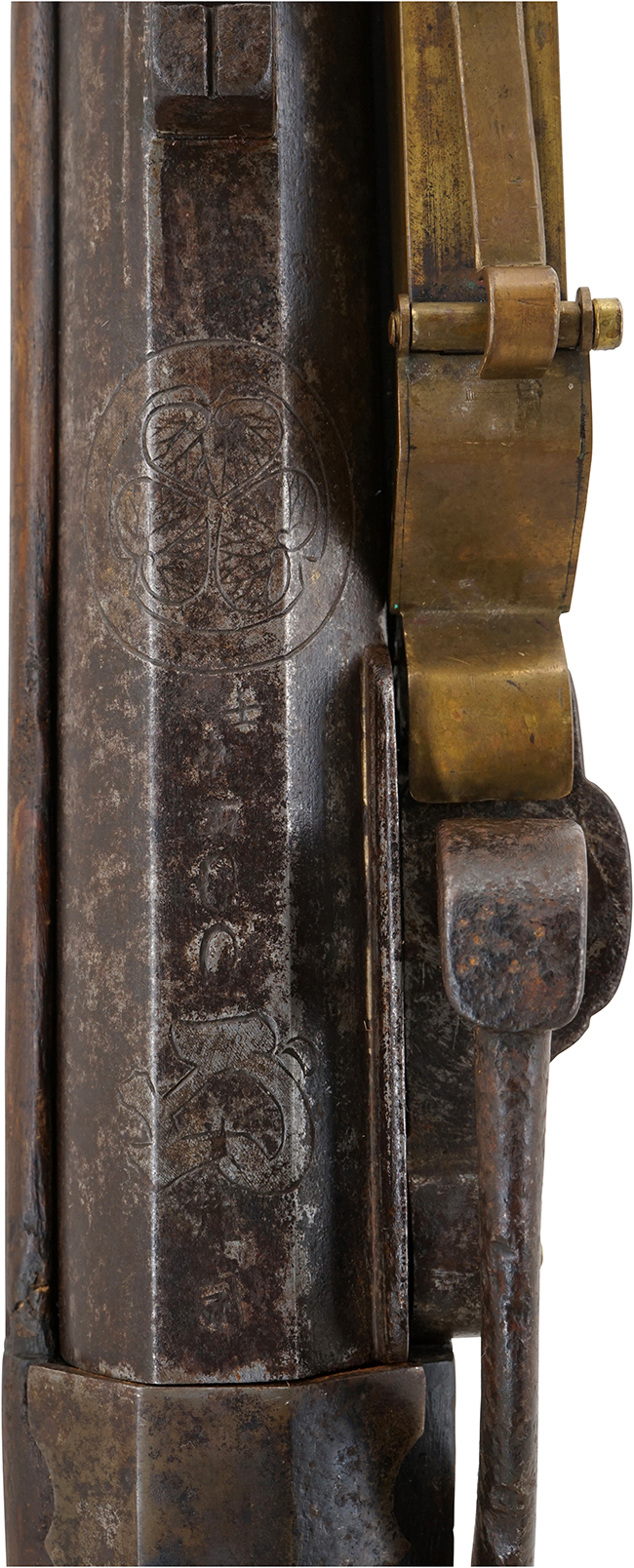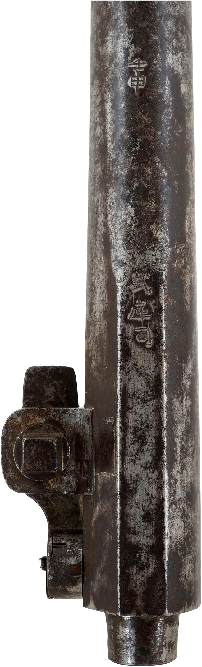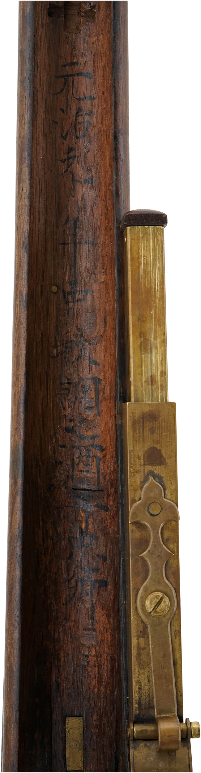 本品の銃身は一部に若干の表面錆や僅かな朽ち込み痕は見受けられるものの、目立った破損や欠損等は見受けられず、比較的良好な状態が保たれています。 銃身内は銃口から銃身後部まで抜けています。 銃床については若干の小傷や線傷は見受けられるものの、大きな破損や欠損は見受けられず、全体に良好な状態が保たれています。 銃床の強度的にはしっかりとした状態が保たれています。 銃床下部の目釘による固定穴及び銃床の目釘穴の位置は二箇所とも一致しています。 真鍮製の目釘が一本付属しています。 真鍮製雷粒ケース、芝引金、引金、桜花金具とカルカの挿入口覆以外の金物は全て武骨な鉄製で時代錆は出ていますが、かえって速射性を持たせた軍用筒のイメージが強い纏まった外見をしています。 銃身後部上方に壬申の刻印「壬申 武庫司」の刻印が入っています。