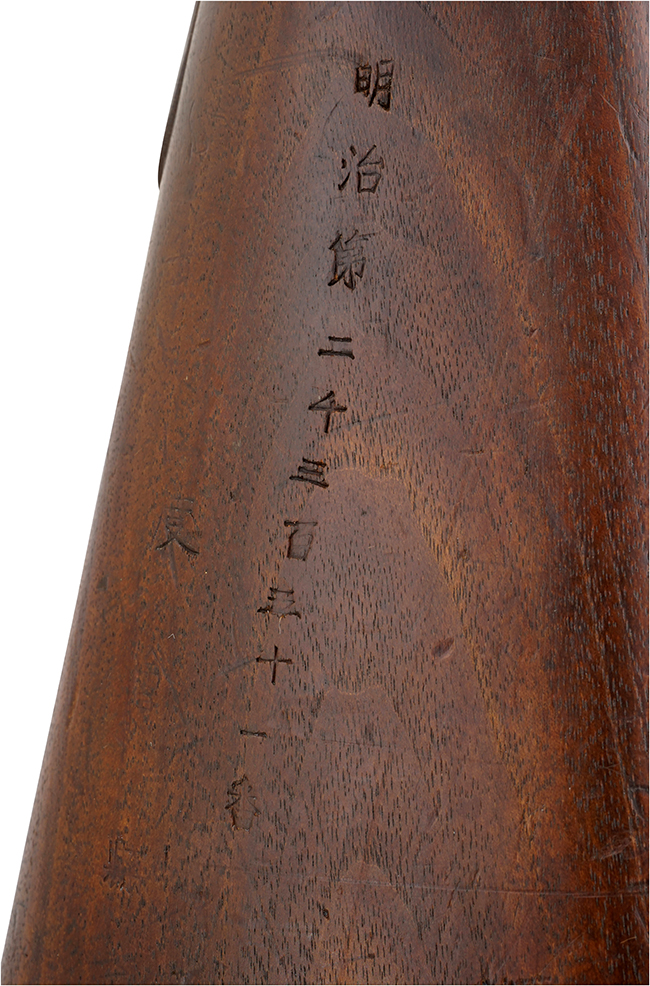 本品のバット・ストック左側面には「明治第ニ千三百五十一番 度會縣」の刻印が確認出来、これは壬申刻印に相当する検査刻印と考えられます。