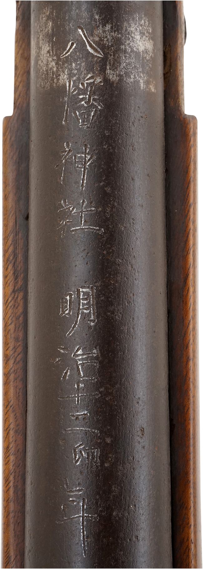 本品の銃身上部後方には、鏨により「八幡神社 明治十二卯年 高田治兵衛吉位[花押] 納之 五十九歳」と奉納銃である事が刻まれています。 これは、「五十九歳の高田治兵衛吉位が明治十二(己卯の年)年に八幡神社へこれ(ゲベール銃)を納めた」という意味です。 登録証では「明治十二年 高田治兵衛吉位」となっていますが、「明治十二卯年 高田治兵衛吉位」が正しいと思われます。