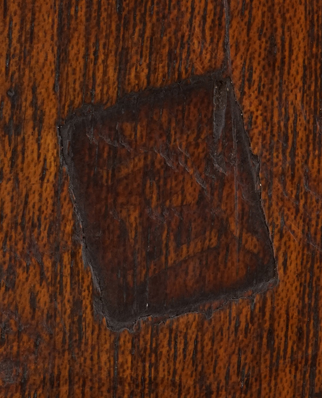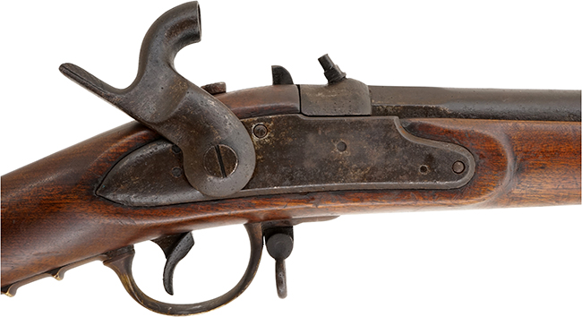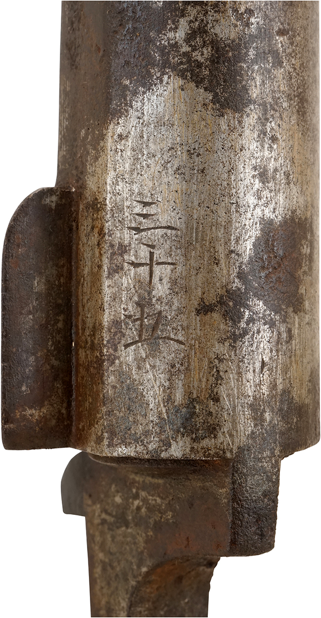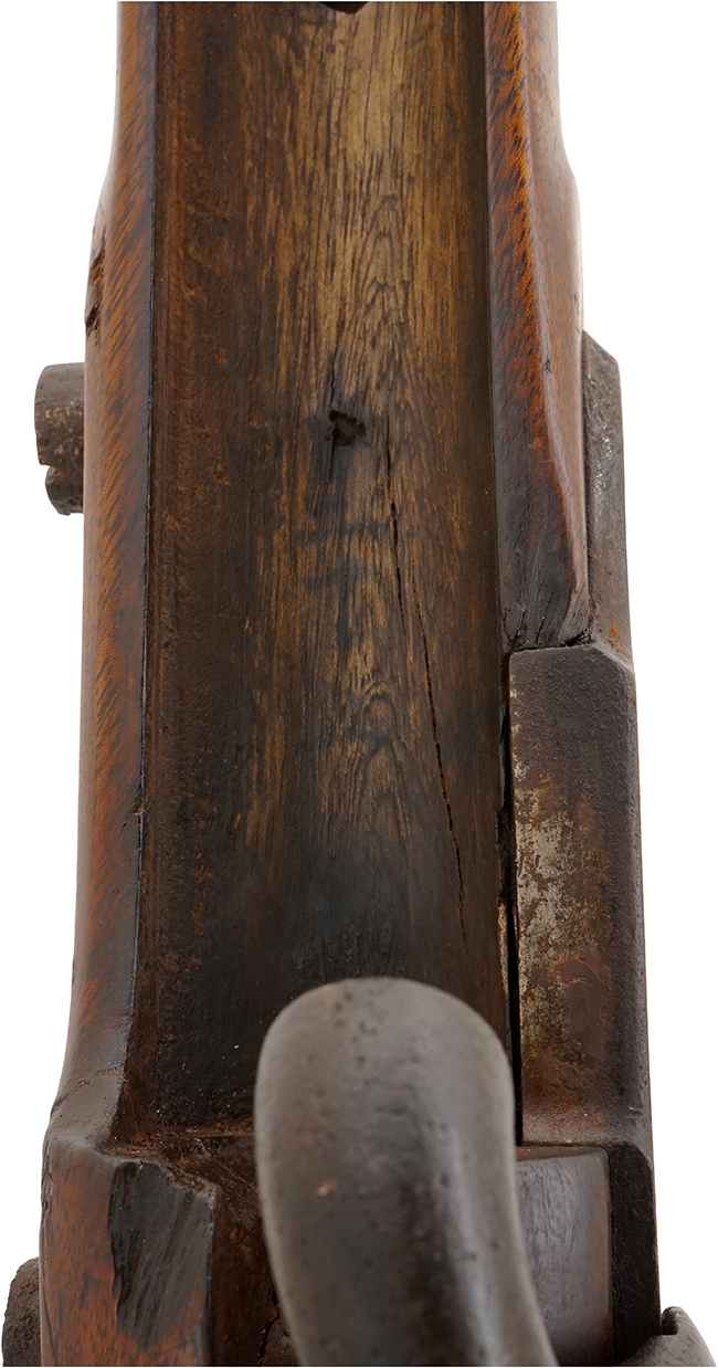 本品は全体に適度な時代が付いており、銃身や機関部といった鉄部は、やや時代錆や若干の表面錆痕は見られるものの、目立った欠損等は見られず、概ね良好な状態が保たれています。 木製銃床については、やや打ち傷や線傷の他、銃身後端付近の木部に一部若干の欠けやひびの補修痕が見られ、バット・プレート取り付け部周辺の木部にも僅かに欠けが見受けられますが、それ以外には大きな破損等は見られず、概ねしっかりとした状態が保たれています。 尚、バット・ストック右側面には非常に薄くなっており判読が難しいものの、四角形の中に何らかの漢字と思われる文字が入った刻印が確認出来ます。 真鍮製のバレル・バンドやトリガー・ガードについては、適度な時代が付いた良い雰囲気となっています。 前後のスリング・スイベルには現状固着等は見られません。