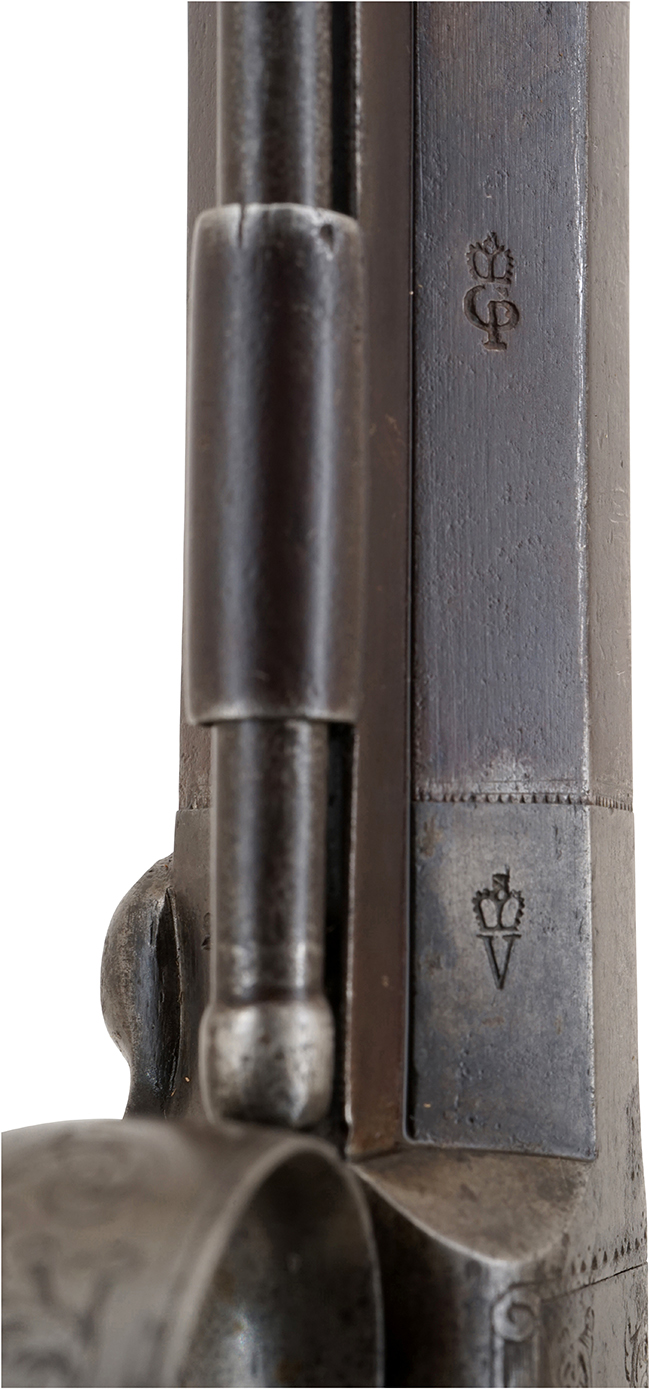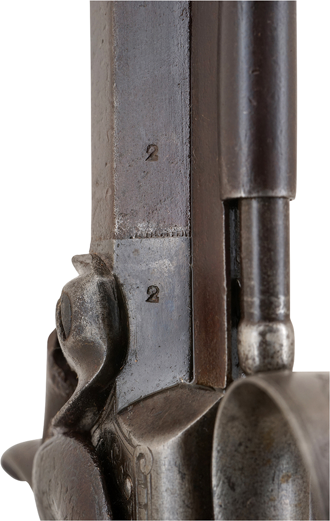 本品の銃身上面には、一部薄くなっており判読が難しいものの、「□□□□ER FIELD & SONS. 253. HOLBORN. LONDON.」のメーカー刻印が確認出来ます。 また、グリップ前面下部には「9173」の番号が確認出来ます。 本品の銃身及び銃身基部の下部左側には、英国のLondon Proof Houseで1637年から使用されている「王冠にGP」の刻印 (Definitive Proof=最終耐久テスト終了刻印) 及び1670年から1955年まで使用された「王冠にV」の刻印 ((View Mark=目視検査終了刻印) が確認出来ます。 また、銃身及び銃身基部の下部右側にはそれぞれ「2」の番号が打刻されています。