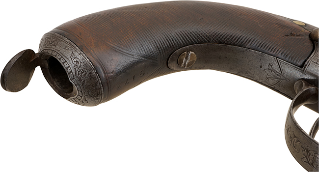 本品は全体に適度な時代が付いた良い雰囲気となっており、銃身や本体といった金属部はやや打ち傷や時代錆の他、一部に表面錆痕が見られるものの、目立った欠損等は見られず、本体やトリガー・ガード、グリップ下部に施された植物を象った彫刻も大部分がはっきりと残っています。 木製グリップについては、チェッカリングが全体にやや薄くなっており、打ち傷や線傷の他、グリップ基部及び左側面中程に一部ヘアライン・クラックが見受けられ、グリップ基部付近には補修痕が見られるものの、現状強度的には比較的しっかりとした状態が保たれています。