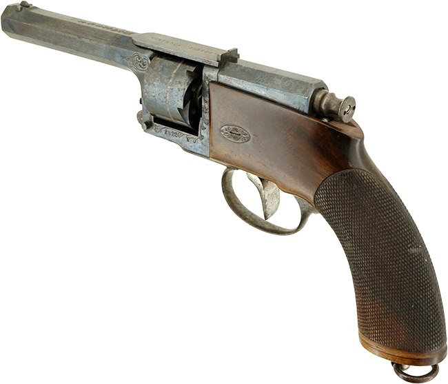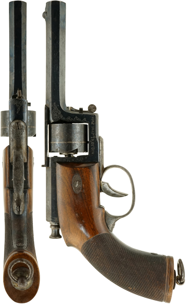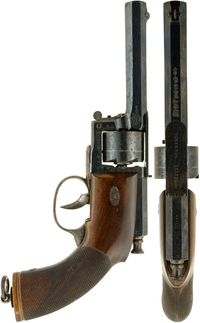 ドライゼ M1850 ピストルは、Dreyse Zuendnadrevolver, Kleines Modell の名称で開発され、1850年にM1850としてプロイセン軍に採用されたリボルバーです。 針状の長い撃針を前後にダブル・アクションでスライドさせ、シリンダー内の紙製薬莢内の雷管を打つという、世界的に見ても非常に珍しい機構を持つ拳銃です。