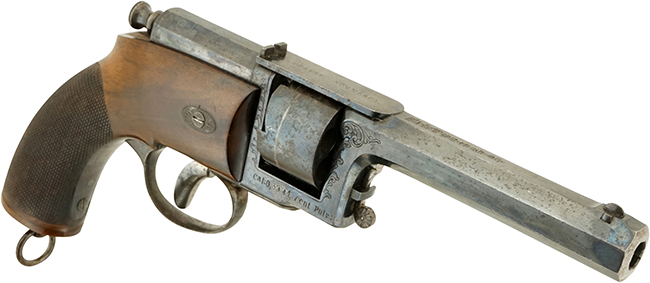 本品の銃身やフレーム、シリンダーといった金属部には、大部分にオリジナルのブルー仕上げが残っており、若干の経年による褪色や許容範囲内の朽込み痕が見られるものの、総じて良好な状態が保たれています。 他のリボルバーにはない大型木製グリップは、打ち傷なども最小限で、オリジナルのニス仕上げとチェッカリングも完全です。 トリガーを引くとダブル・アクションによりシリンダーが歯切れ良く回転し、コッキング・ピースが前後します。 銃身内は銃口から銃身後部まで完全に抜けて (通って) おり、ライフリングも深くはっきりと確認出来ます。 (MM)(KK)