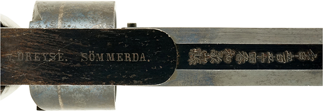 本品のフレーム右側面には「Cal.0,39 4 1/2 Cent Pulv」とプロイセン・インチの表示が入っています。 (弊社在庫品のもう一挺のドライゼ M1850 ツンナール リボルバーでは、「Cal.0,35 12 Gran Pulv」の口径表示となっています)。 フレーム左側面には唐草模様の中に2522のシリアル・?發?入っています。 フレーム上面には「v. DREYSE. Soemmerda.」とドライゼのメーカー名と工場のあったドイツのゼンマーダーの地名 (Erfurt造兵廠のあった場所から10km程北部) が入っています。 この「v. DREYSE.」の刻印は、1864年にドライゼが爵位を授かって以降の後期の製品に見られ、それ以前は「F. DREYSE.」のメーカー刻印が用いられていました。