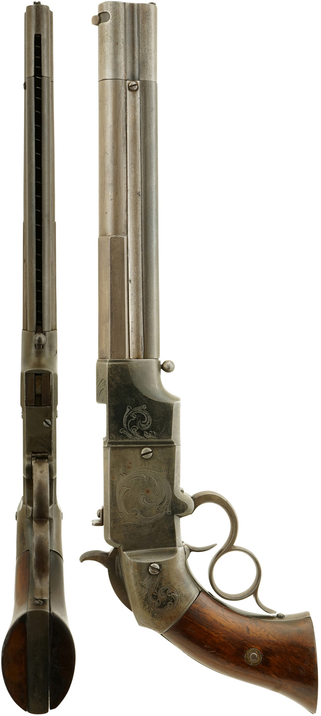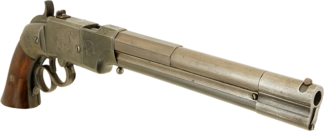 その後、同社は砲金製フレームを備えたレバー・アクション式のネービー ピストルを製造するようになりました。 このピストルは.41口径で、6インチおよび8インチの銃身のモデルが存在し、それぞれNo.1 (ベルト・モデル) およびNo.2 (ホルスター・モデル) として区別されていました。 弾倉チューブの装弾数は、6インチのベルト・モデルが8発、8インチ銃身のホルスター・モデルが10発となっていました。 また、16インチの銃身と着脱式のショルダー・ストックを備えたレバー・アクション式のピストル・カービン (No.3) も製造されました。 これらのピストルおよびピストル・カービンは、同じシリアルNo.の範囲内で製造されました。