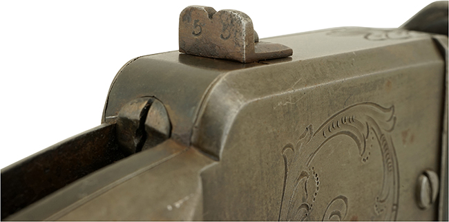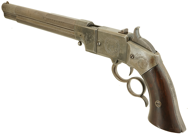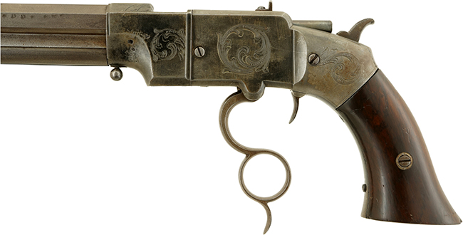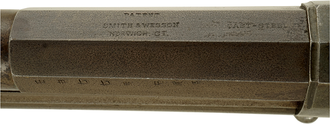本品はスミス & ウェッソン (S&W) 社が1854年から1855年までの1年間のみ製造した、初期のボルカニック・ピストルの1挺です。 本品は大型フレームを備えた.41口径のNo.2と呼ばれるモデルで、銃身長が8インチのバリエーションです。 S&W社では、.31口径 (小型フレーム) のNo.1を約1,200挺、.41口径 (大型フレーム) のNo.2を約500挺製造したとされています。 本品のグリップ・パネルを外したグリップ・フレーム左側面には55のシリアルNo.が打刻されている事から、本品がS&W社で極初期に生産された品である事が窺えます。 尚、S&W社で製造されたボルカニック・ピストルのフレームは鉄製となっており、控えめなスクロール・エングレービングが全ての個体に施されていました。 本品のフレームにもオリジナルのファクトリー・エングレービングがはっきりと確認出来ます。 銃身上面には一部僅かに薄くなっていますが「PATENT SMITH & WESSON NORWICH. CT.」が三行で打刻されている他、「CAST-STEEL」の刻印も確認出来ます。