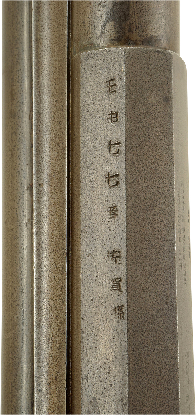 (種別: 管打ち式銃砲、全長: 36.5cm、銃身長: 17.8cm、口径: 1.0cm、銘文: PATENT SMITH &WESSON NORWICH.CT CAST-STEEL)