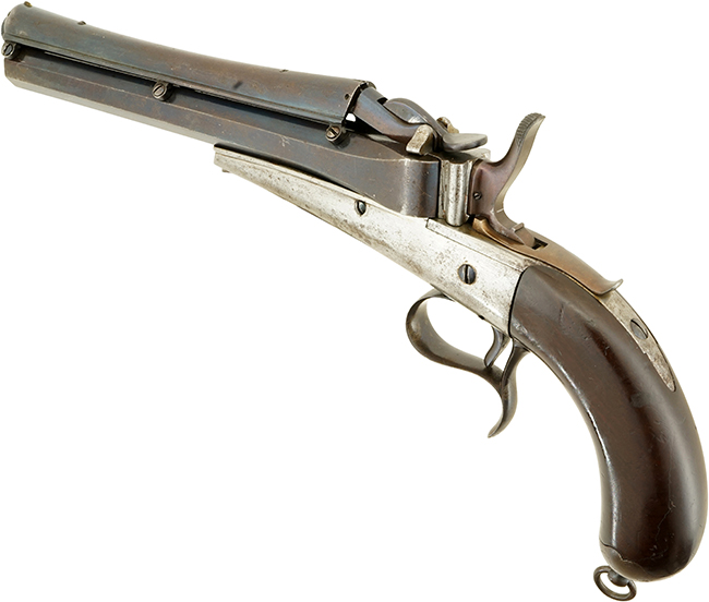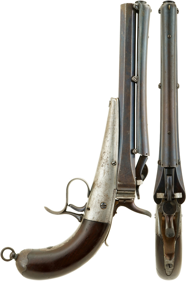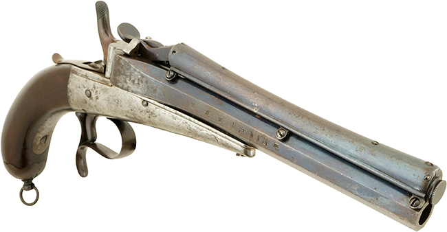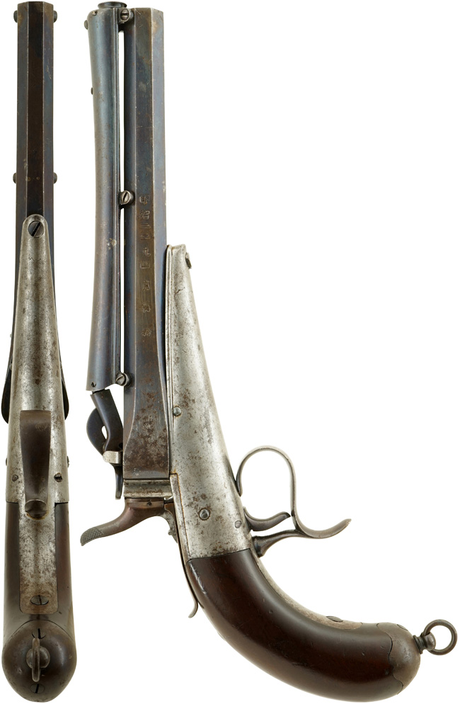 本品はベルギー人のヴィクトル・コレー (Victor Collette) が1853年にベルギーでパテントを取ったGravity Feeding Systemを採用した特殊な拳銃です。 銃身上に銃身と並行に筒状弾倉 (チューブ・マガジン) があり、その筒の前部の蓋を開けて弾を装填します。 筒状弾倉の中には20発のボルカニック・ピストルと同じような「ロケット・ボール = Rocket Ball」と呼ばれる、中空の弾頭の中に装薬を詰めたケース・レス (無薬莢) 弾が入ります。 チューブ・マガジンでありながらも、ボルカニック、ヘンリー、ウィンチェスターなどのようにバネの弾力で弾を送り込むシステムではなく、銃身を上に向けた際に重力 (Gravity) によって弾がブリーチに送り込まれる仕組み (Feeding) になっています。 その為、欧米ではGravity Feeding System (= グラビティ・フィーディング・システム) と呼ばれています。 日本では輸入された当時は隠倉銃と呼ばれたようです。 全く同じ品が古式銃のバイブルとも呼ばれる所荘吉先生の「図解古銃事典」(雄山閣出版、各県の教育委員会の登録審査会場でも資料として使用) のP.217に同じ品と見間違えるような、全く同じモデルが「靖国神社蔵」として写真が載っています。 前頁 (P.216) には隠倉銃 (Gravity-feed Repeating Needle Gun、ドイツ)、その使用方法、構造が書かれています。 ただ使用弾薬が「ドライゼ薬莢を使用する針打式」と書かれていますが、それは間違いで「無薬莢のロケット・ボール弾」を使用します。 使用方法は銃身を上に向けてハンマーをハーフ・コック・ポジションまで起こすとブリーチ・ブロックが上昇して筒状弾倉の後ろに位置します。 弾は重力によってブリーチ・ブロックの手前まで押し下げられ、筒状弾倉の後部に取付けられたツメが同時に作動し一発ずつ薬室に送り込まれます。 そしてフル・コック・ポジションまで起こすとブリーチ・ブロックが下方に降りて撃発準備が整います。 あとはシングル・アクションの引き金を引き「発射」、その後同じように次弾を送り込む為に銃身を上に向けてハンマーを起こします。 ケース・レス (無薬莢) 弾のため、排莢は行いません。 このように当時の連発銃の主流であった回転式のシリンダーや複数の銃身を持たない外見から弾倉が無いように見えるため隠倉銃 = 隠れた弾倉の銃と呼ばれたのではないでしょうか? この隠倉銃 (Gravity Feeding Pistol) は1855年のパリで開かれたフランス初の第三回国際博覧会 (=パリ万博、初めて万国博覧会と称す) に出品されました。 しかしながら「無薬莢ロケット・ボール弾」は装薬が少ないので、初速が遅く近距離でしか有効ではありませんでした。 またヨーロッパでは管打式 (パーカッション・ファイア) からカニ目打式 (ピン・ファイア) への移行期で、更にアメリカでは1857年にS&Wが貫通式シリンダーと縁打式 (リム・ファイア) の組み合わせた新しい連発銃を発売した時期でもあってGravity Feeding Pistolは全く普及しないで終わりました。 そのような理由で欧米でもGravity Feeding Pistolは非常に珍しく、その特殊な連発方式は当時の試行錯誤の産物と言っても良いでしょう。 「無薬莢ロケット・ボール弾」の供給が難しい日本において一体何挺のGravity Feeding Pistol (隠倉銃) が使用されたのでしょうか? 一説では弘前藩がヨーロッパから10挺を輸入した内の一挺と言われています。「名古屋刀剣博物館」と「靖国神社蔵」の収蔵品と本品を含む2挺が弊社在庫、個人蔵の2挺の合計6挺以外には弊社では存在を知りません。 この銃のパテントを取ったヴィクトル・コレー (Victor Collette) は1857年から1861年までベルギーのリェージュ・プルーフハウスに登録していましたが、欧米に残るGravity Feeding Pistolにはその時期のリェージュ・プルーフが刻印されていないことから、この銃は1857年までに製造を終えていたと考えられます。 あのウィンチェスター社のレバー・アクションの元となったボルカニック社が短命に終わったのも「無薬莢ロケット・ボール弾」が「リム・ファイア弾」より威力が少なかった事と同じでしょう。 ボルカニック社は倒産、分裂しましたが、ヴィクトル・コレーは小さな銃工房であった為、その後細々とピン・ファイア・リボルバーの生産を続けました。