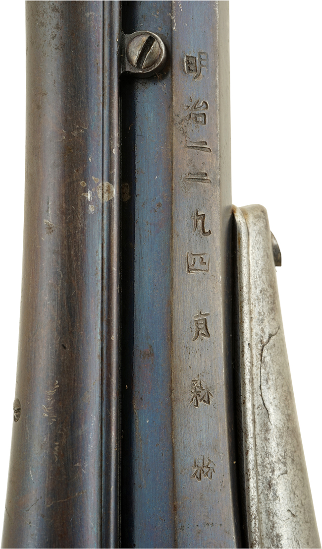 本品は古式銃としては最高のコンディションの部類に入る約99%オリジナルの仕上げが残った非常に程度の良い品です。 オリジナルの仕上げの上に極僅かな表面錆が出ていますが、目立った朽ち込み等は見受けられません。 八角形銃身の左側面に鏨で「明治二二九四青森縣」と刻まれている以外はメーカー刻印などが一切ありません。 国内での現存品の全ては青森縣の「明治二二九四」連番です。 作りは非常に良く製造所の技術の高さが伺われる作品です。 小傷も含め気になる傷が全くない極上品です。 作動については完全で、ハンマーのハーフ/フル・コックはしっかりと掛かり、ハーフ・コック位置で銃身が上昇して弾倉からブリーチ・ブロックへの弾頭の装填が可能となります。 弾頭をブリーチ内に押し込む為の爪の動きや弾倉前部のカバーの開閉についても問題なく行う事が可能です。 銃身は銃口から薬室まで貫通しています。