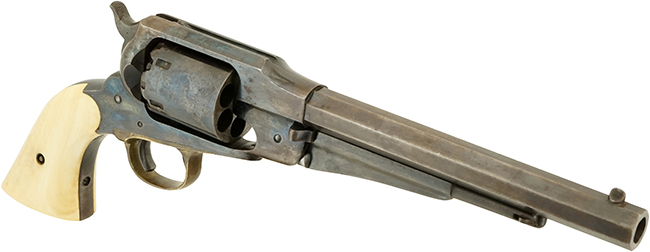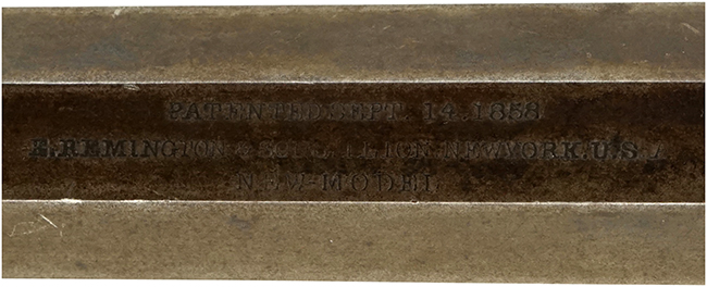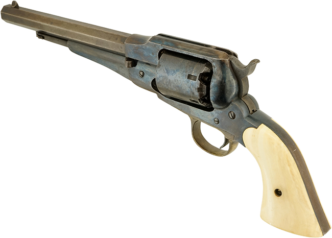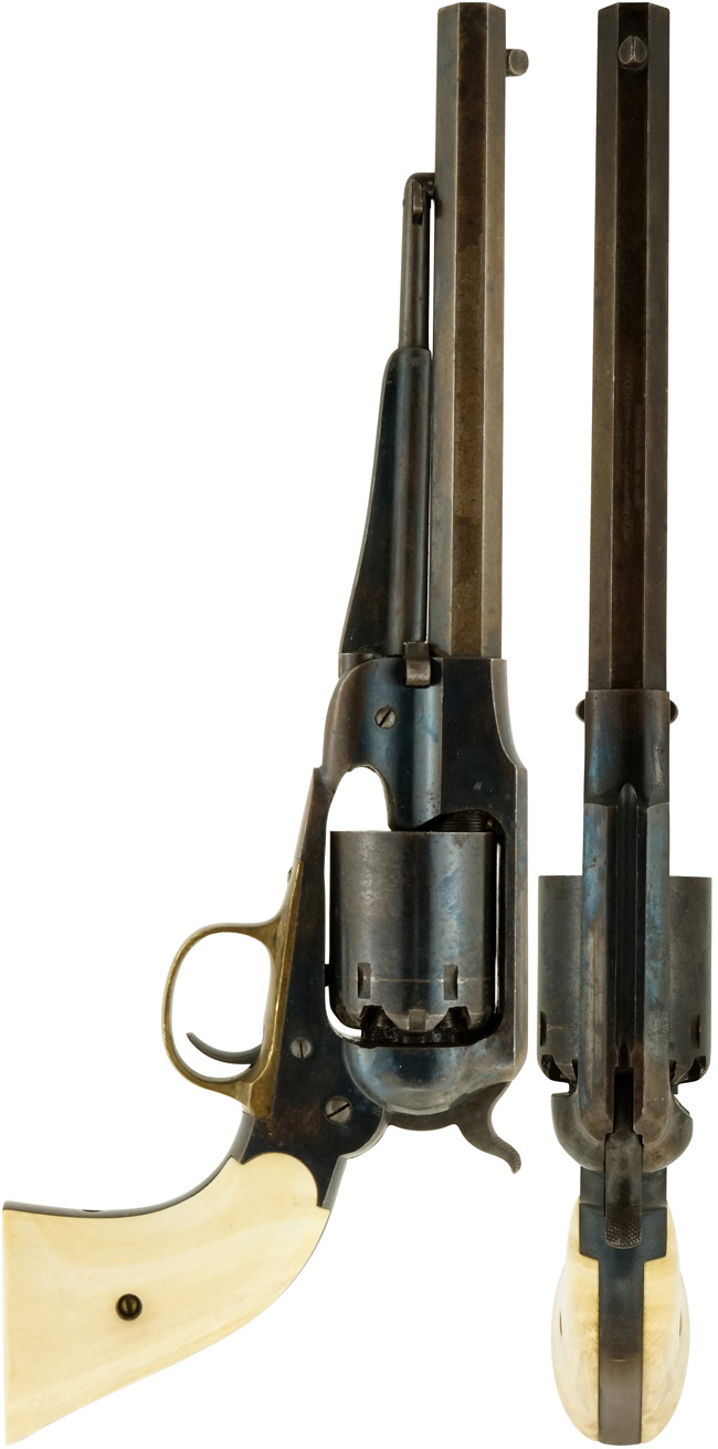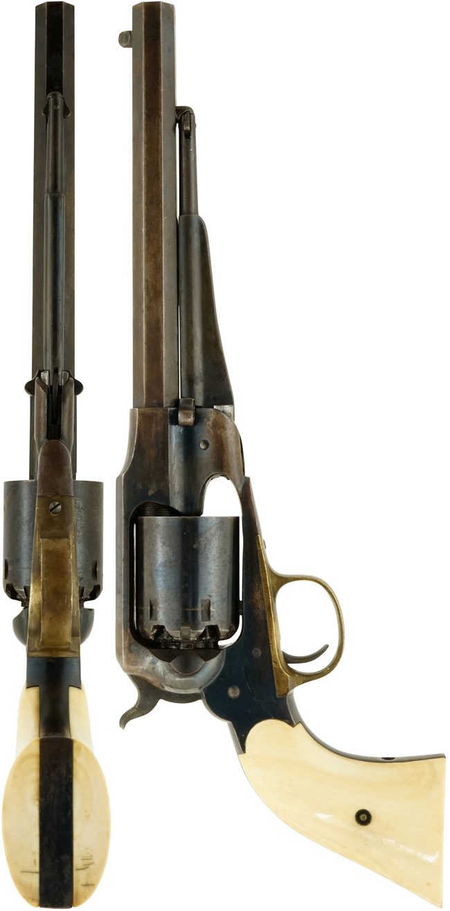 本品は銃身上面に「PATENTED SEPT. 14, 1858」のパテント刻印や「E. REMINGTON & SONS. ILION. NEW YORK. U.S.A.」のレミントンのメーカー・アドレス刻印に加えて、「NEW-MODEL」のモデル名刻印が三行にわたって打刻された後期型です。 本品のグリップを外したグリップ・フレーム左側面と銃身下部にはマッチした「86159」のシリアルNo.が入っています。 その他、シリンダーに「W」、銃身後部右側面に「F」、銃身後部左側面に「W」、トリガー・ガード下面に「W」の刻印が入っています。 尚、シリンダーのシリアルNo.は6195となっています。 本品にはアイボリー製グリップが取り付けられています。
