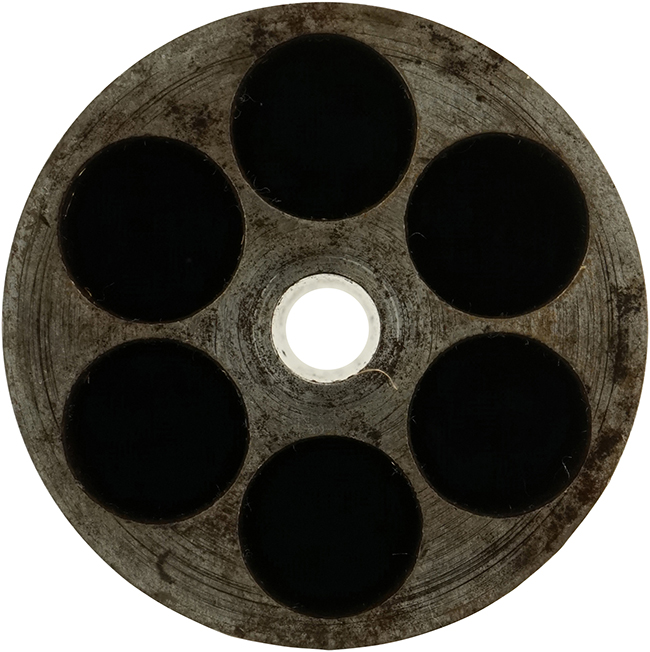 作動については完全で、ハンマーのハーフ/フル・コックはしっかりと掛かり、シリンダーも正常に回転します。 フル・コック位置でトリガーを引くと、ハンマーがスムーズに落ちます。 銃身内は銃口から銃身後部まで完全に抜けて (通って) おり、僅かに表面錆は見られるものの、ライフリングも深くはっきりと確認出来ます。 パーカッション・ニップルには現状目立った欠けや変形は見られず、比較的良好な状態が保たれています。