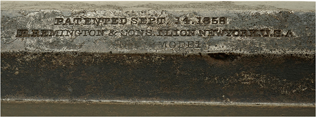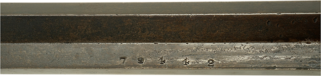 本品は銃身上面に「PATENTED SEPT. 14, 1858」のパテント刻印や「E. REMINGTON & SONS. ILION. NEW YORK. U.S.A.」のレミントンのメーカー・アドレス刻印に加えて、「NEW-MODEL」のモデル名刻印が三行にわたって打刻された後期型です。 尚、「NEW-MODEL」のモデル名刻印は、「NEW-」の部分が薄くなり判読が難しくなっています。 本品のグリップを外したグリップ・フレーム左側面と銃身下部にはマッチした「79442」のシリアルNo.が入っています。 また、グリップ・フレームに209、シリンダー後部には01及び53の番号が確認出来ます。 その他、シリンダーに「J」、銃身後部右側面に「R」、銃身後部左側面に「D」、トリガー・ガード下面に「A」の刻印が入っています。 尚、グリップ左側面下部にはやや薄くなっているものの、米国陸軍のインスペクター花押とも呼べる、イニシャルが入った刻印 (Cartouche=カートゥーシュ) が打刻されているのが確認出来ます。