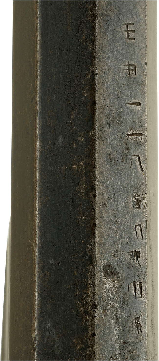 明治4年に明治陸軍は主力小銃の統一化を図る為、旧藩に残る銃砲の種類、挺数の把握が急務となりました。 翌明治5年 (1872年、壬申) 1月から、太政官布告第28号第五則の「銃砲取締規則」によって、私蔵されていた銃砲の「我が国初の管理統制」が始まりました。 廃藩時に旧藩は旧家臣に軍用銃を下付した事例が多く見られ、旧士族の家には一挺の軍用銃があったとも言われています。 それらの銃はその後市中に大量に出回り私蔵されていました。 銃砲取締規則ではこれらの私蔵されていた銃砲について、管轄庁 (東京と大阪は武庫司) に持参して改刻印式によって番号、官印を受ける (これが明治5年度であれば壬申刻印と番号) 事が義務付けられました。 同時に管轄庁は同人名と番号を管轄鎮台に届け出て、鎮台より武庫司にそれらが提出される仕組みになっていました。 この調査は明治20年代頃まで銃砲調査が行われましたが、明治5年 (1872年=壬申) の調査が最も大々的に行われ、今日この種類の刻印の内90-95%が壬申の年に行われた事から、古式銃に打たれた漢字の刻印をまとめて「壬申刻印」と呼ばれています。 本品は「壬申 一一八番 和歌山縣」の刻印が入っている事から、明治5年に和歌山県に届け出が行われた品である事が判ります。