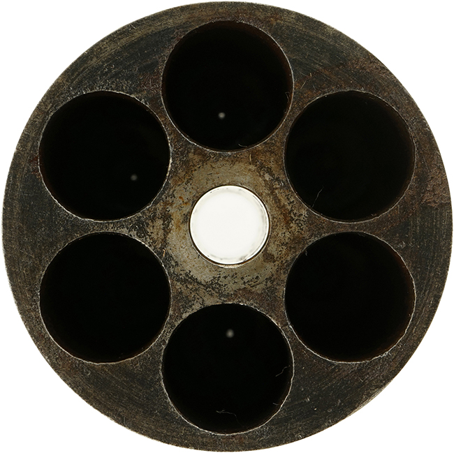作動については完全で、ハンマーのハーフ/フル・コックはしっかりと掛かり、シリンダーも正常に回転します。 フル・コック位置でトリガーを引くと、ハンマーがスムーズに落ちます。 銃身内は銃口から銃身後部まで完全に抜けて (通って) おり、やや表面錆は見られるものの、ライフリングも比較的残っています。 パーカッション・ニップルには現状目立った欠けや変形は見られず、比較的良好な状態が保たれています。