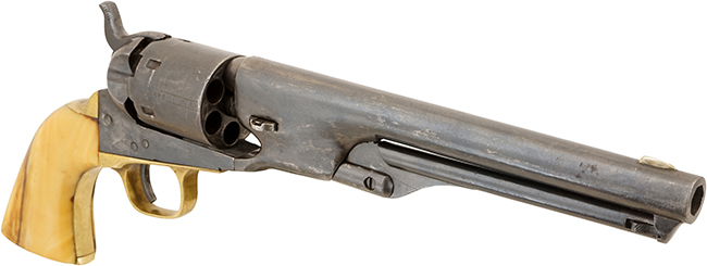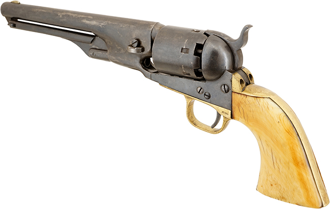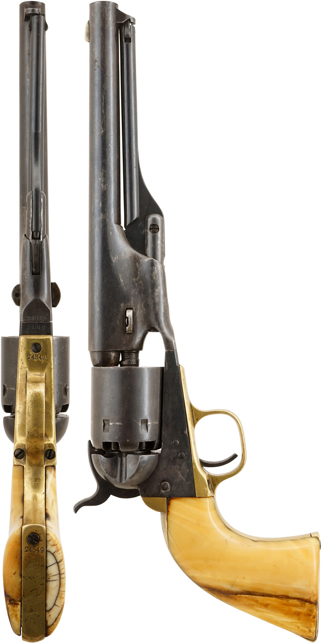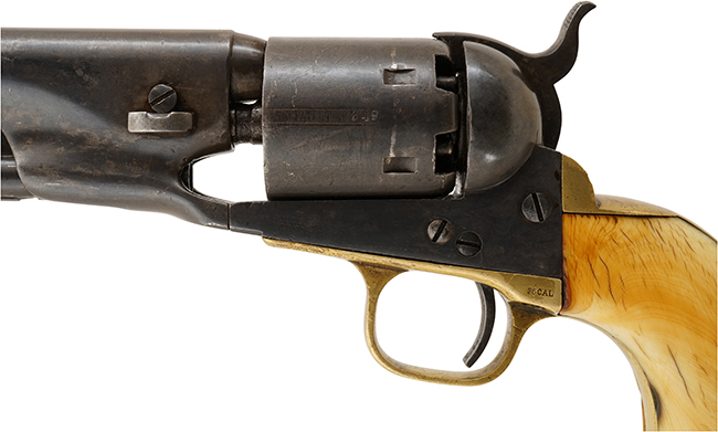 本品の銃身やフレーム、シリンダーといった鉄部は全体に仕上げ直しによるブルー仕上げが施されており、やや打ち傷や経年による褪色、若干の表面錆痕及び僅かな朽ち込み痕が見られるものの、大きな欠損等は見られず、概ねしっかりとした状態が保たれています。 トリガー・ガード上部のフレーム左側面に僅かにひびが見受けられますが、強度的には殆ど影響のないレベルのものです。 真鍮製のトリガー・ガード及びバック・ストラップについては、やや磨かれており、若干の打ち傷が見られますが、現状目立った腐食や変形等は見られません。 尚、バレル・ウェッジは交換されていますが、これは当時の補修によるものです。 適度に時代が付いて良い色合いとなったアイボリー・グリップは、右側グリップに一部古い補修痕が見られるものの、違和感は殆ど感じられず、グリップ・フレームへの取り付けもがたつきもなくしっかりとしています。