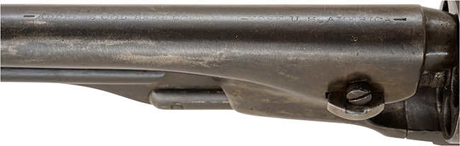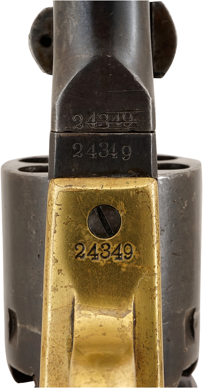 本品のシリアルNo.は24349で、シリアルNo.から1864年 (文久3年-元治元年) に製造された品である事が判ります。 シリンダーはラウンド・シリンダーとなっており、トリガー・ガード及びバック・ストラップは真鍮製、フレームはストック用の切り欠きのないスタンダードなタイプとなっています。 銃身上面にはやや薄くなっていますが「- ADDRESS COL. SAML COLT NEW-YORK U.S. AMERICA -」のメーカー・アドレス刻印が確認出来ます。 シリンダー表面のカンペチェ海戦 (Naval Battle of Campeche) の場面のロール・エングレービングについては、一部を残して大部分が薄くなっています。 シリンダーのパテント刻印についても薄くなっていますが、確認は可能です。 シリンダーのシリアルNo.刻印についてははっきりと確認が可能です。 フレーム左側面の「COLTS PATENT」の刻印はやや薄くなっているものの確認は可能です。 トリガー・ガード基部左側面の「36 CAL」の刻印ははっきりと残っています。 本品のシリアルNo.は、銃身、フレーム、トリガー・ガード、バック・ストラップ、シリンダーが(24)349でマッチしています。 シリンダー軸については892となっています。