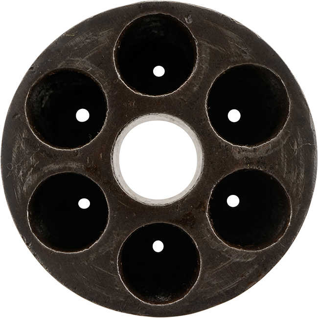 作動については完全で、ハンマーのハーフ/フル・コックについてはしっかりと掛かり、シリンダーも正常に回転します。 銃身内は銃口から銃身後部まで完全に抜けて (通って) おり、やや表面錆は見られるものの、ライフリングは比較的はっきりと確認出来ます。 コルト系リボルバーの持病とも言える、銃身とフレームの取り付けのがたつきやシリンダーの前後の遊びについては、現状殆ど見られません。 ローディング・レバーは左右に若干の遊びは見られますが、機能については問題なく、前方に折り畳んだ際のキャッチもしっかりと掛かります。 シリンダーのパーカッション・ニップルにはやや時代錆が表れているものの、現状目立った欠けや変形等は見られず、比較的良好な状態が保たれています。