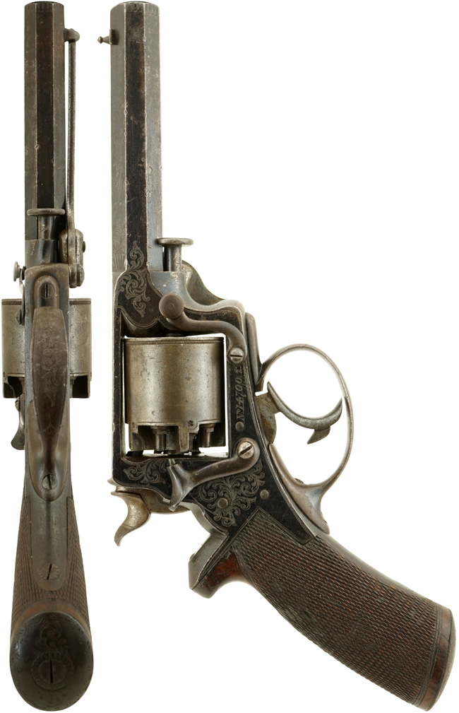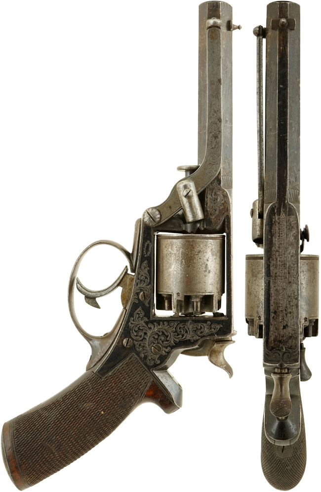 英国のウィリアム・トランター (William Tranter) は、1853年1月28日に「ヘジテート・アクション」とも呼ばれる特徴的な作動をするダブル・トリガー・リボルバーに関する英国パテント第212号を取得し、これを製品化しました。 このダブル・トリガー・リボルバーは製造開始時期により1st モデル (1853~1854年)、2nd モデル (1853~1856年)、3rdモデル (1860年~) と呼ばれ、細部の仕様が異なります。 その後、トランター社では1860年頃からボーモントのダブル・アクション機構を取り入れたオーソドックスな形状のリボルバーも製造が開始され、こちらはシングル・トリガー・モデルと呼ばれてダブル・トリガー・モデルとは区別されています。 ボーモントのパテントは、真の意味でのダブル・アクション機構で、現代リボルバーと同様にダブル・アクション及びシングル・アクションの操作が可能となりました。