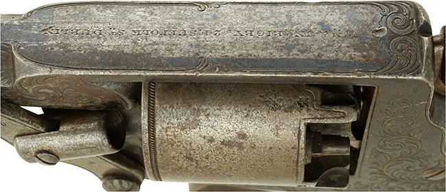 本品の銃身左上側面にはバーミンガム (Birmingham) プルーフ・ハウスの刻印が二種類打刻されています。 一つは1813年から1904年の間に使用されたクロス・ソードの上に王冠、下に「View Mark」を表す「V」が入ったView Markプルーフ刻印です。 もう一つは1813年から1904年の間に黒色火薬を使用する銃身だけに入れられた、クロス・ソードの上に王冠、下に「Proof」を表す「P」、左右に「Birmingham」を表す「B」が左に、そして「Company」を表す「C」が右に入ったBirmingham Company Proof刻印です。 また、シリンダー表面の各チャンバー間にも同様の刻印が交互に打刻されています。 尚、これらの刻印は非常に小さく、打刻されている文字の判読は難しくなっています。