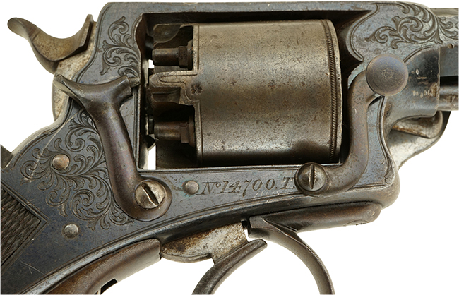 本品はトランター ダブル・アクション・リボルバー 4thモデルの内、口径80ボア (.38口径) で銃身長4 1/2インチのポケット・モデルです。 ローディング・レバーに「W.TRANTER'S PATENT」の刻印が入っている他、フレーム左側面下部にも同様の刻印が小さく入っています。 また、フレーム右側面下部にはシリアルNo.が「14700.T.」と入っています。 シリアル No.の後の「T」はTranter社製を表しており、同じTranter Patentの銃でもTranter社で製造された品である事が判ります。