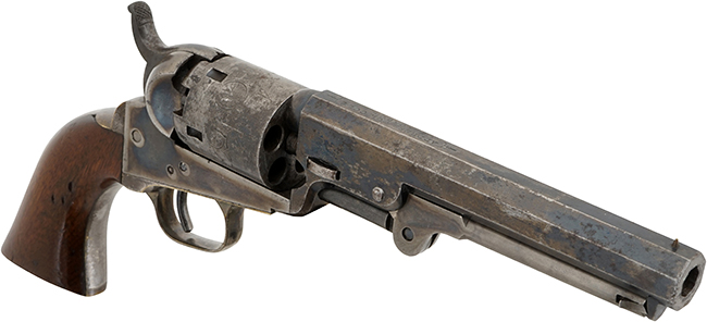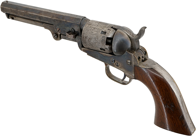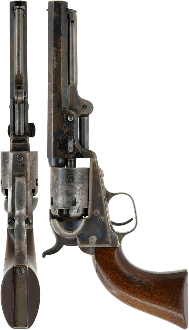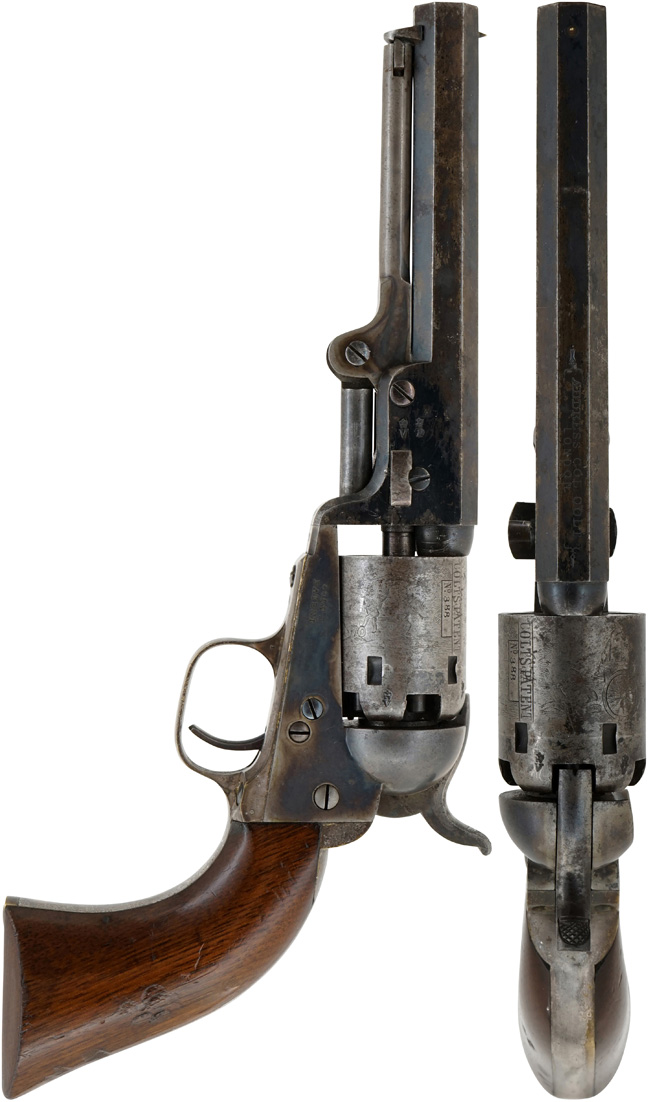 本品は銃身長5インチ、5連発モデルのコルト M1849 ポケット リボルバーです。 銃身の上に細かい文字で「ADDRESS COL: COLT, LONDON.」のメーカー刻印が二行にわたって入っており、銃身左側面やシリンダーには英国のロンドン・プルーフ刻印が入っている事から、コルト社の英国ロンドン工場で製造されたことが判ります。 本品のシリアルNo.は388で、シリアルNo.から1854年製である事が窺えます。 シリアルNo.が388とロンドン工場製としては初期に製造された品であるため、トリガー・ガードは英国製で一般的な鉄製ではなく、銀鍍金が施された真鍮製となっています。 シリンダーの駅馬車 (Stagecoach) のロール・エングレービングや「COLTS PATENT」の刻印は、大部分がはっきりと残っています。 また、フレーム左側面の「COLTS PATENT」の刻印も比較的はっきりと確認出来ます。 シリアルNo.は銃身、フレーム、ローディング・レバー、トリガー・ガード、バック・ストラップ、シリンダー、シリンダー軸、バレル・ウェッジでマッチしています。 ロンドン工場製のM1849 ポケットは、米国製よりも仕上げが丁寧で、当時の英国銃工の技術の高さが窺えます。