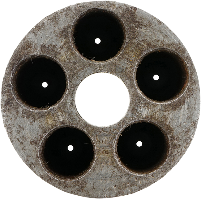 作動については完全で、ハンマーのハーフ/フル・コックはしっかりと掛かり、シリンダーも正常に回転します。 フル・コック位置でトリガーを引くと、ハンマーがスムーズに落ちます。 ローディング・レバーは左右の遊びも殆ど見られず、機能的にも正常で、前方に折り畳んだ際のキャッチもしっかりと掛かります。 コルト系リボルバーの持病とも言える銃身とフレームのがたつきやシリンダー前後の遊びについても、現状殆ど見られません。 銃身内は銃口から銃身後部まで完全に抜けて (通って) おり、僅かな表面錆は見られるものの、ライフリングは深くはっきりと確認出来ます。 シリンダーのパーカッション・ニップルについては、現状目立った欠けや変形等は見られず、良好な状態が保たれています。