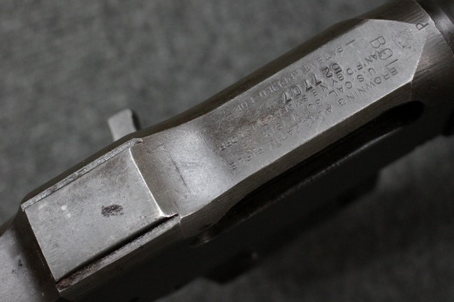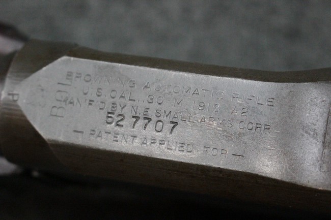 本品はニューイングランド・スモール・アームズ (NESA) で当初からBAR M1918A2として製造された品で、レシーバー上面にはシリアルNo.の他、「BROWNING AUTOMATIC RIFLE U.S. CAL 30 M1918 A2」のモデル名刻印及び「MAN'F'D BY N.E. SMALL ARMS CORP.」のメーカー刻印が打刻されています。 レシーバー上面にはそのほかにも米国武器省 (Ordnance Department) の検査刻印である「クロス・キャノン」刻印及び「P」のプルーフ刻印などが入っています。 バット・ストックは樹脂製となっています。 また、付属の二脚は脚の長さの調整ノブが上部に設けられている1944年5月に採用された後期タイプとなっています。 銃身前部上面にはフレーミング・ボムの刻印と共にニューイングランド・スモール・アームズ社を示す「NE-7」のサブコントラクター刻印の他、製造時期を示す1-44の刻印が入っています。 その他、リア・サイト・ガードには「NE 5-I」及び「C-64231」、ニ脚基部に「NE8-B 147337-A」、ニ脚の右脚に「B 7312235 N」、右脚の石突部分に「B 7312236-1 N」、左脚に「B 7312235-NE22」や「NE1」、左脚の石突部分に「B-7312237-1」の刻印が入っています。 トリガー・ガード・グループは、マガジン・ガイドが一体式となったタイプで、トリガー・ガード下面に「D35470-7 NE6」の刻印が見られます。 バット・プレートはヒンジ式の蓋 (バット・トラップ) が省略された1942年10月に採用されたタイプとなっています。
