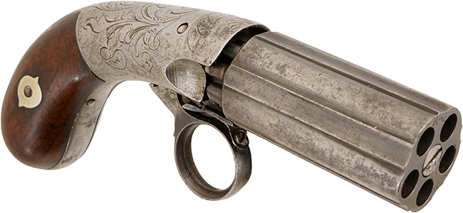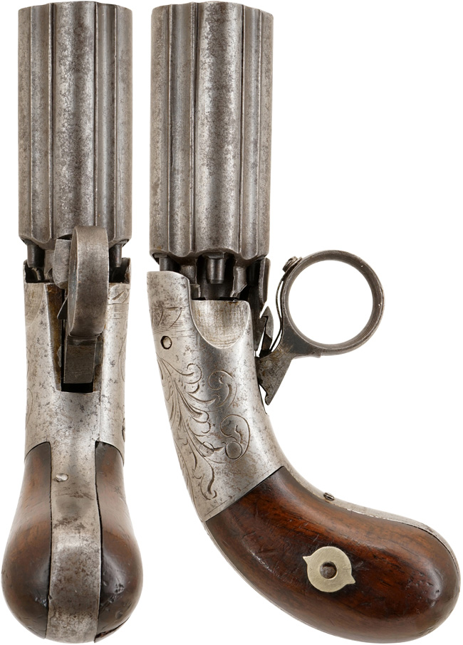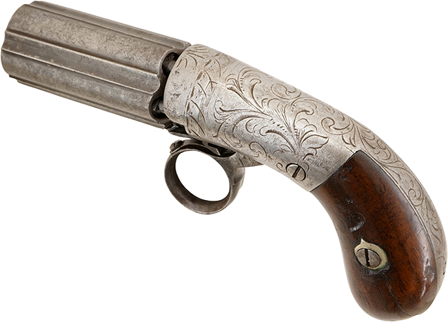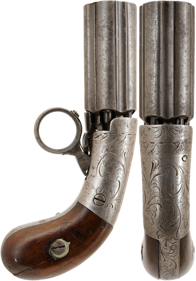 ニューヨークのOrison Blunt氏とJohn G. Syms氏が経営するBlunt &Syms社製のアンダー・ハンマー ペッパーボックスです。 Blunt &Syms社はペッパーボックスやシングルショット ピストルの販売では有名ですが、製造に関しては謎に包まれています。 多くのBlunt &Syms社の商品はメーカー名が刻印されておらず、構造もヨーロッパ系に似たものになっています。特にベルギーのMariette社のシステムと似ており、またそれらを英国でライセンス生産したJ.R.Cooper社の製品にも似ていますので、一部ではBlunt &Syms社は輸入販売会社で製造は行っていなかったとも言われていますが、確かな証拠はありません。現在知られていることはOrison Blunt氏はガンスミスでJohn G. Syms氏はスポーティング・グッズのビジネスをしていた事です。 当時の銃の販売はスポーティング・グッズとして扱われることが多いので当然John G. Syms氏にも銃砲の知識はあったと思われます。Orison Blunt氏が製造分野をJohn G. Syms氏が販売分野を担当していたと考えられています。 本品は .25口径のかなり小型の5連発で、Blunt &Syms社の(本品の様な)小型ペッパーボックスは銃口部に「R-C」の刻印が打たれており、フレームの右側面に大きな雷管装着用の溝があるのが特徴です。 本品はまさにその掟に沿った品です。 また現存しているBlunt &Syms社の小型ペッパーボックスのフレームには唐草模様の彫刻が施されています。 Orison Blunt氏が1849年にアンダー・ハンマー ペッパーボックスの特許を取得した時のブループリントが残されていますので、本品は1850年頃に製造されたと考えられます。(MM)
