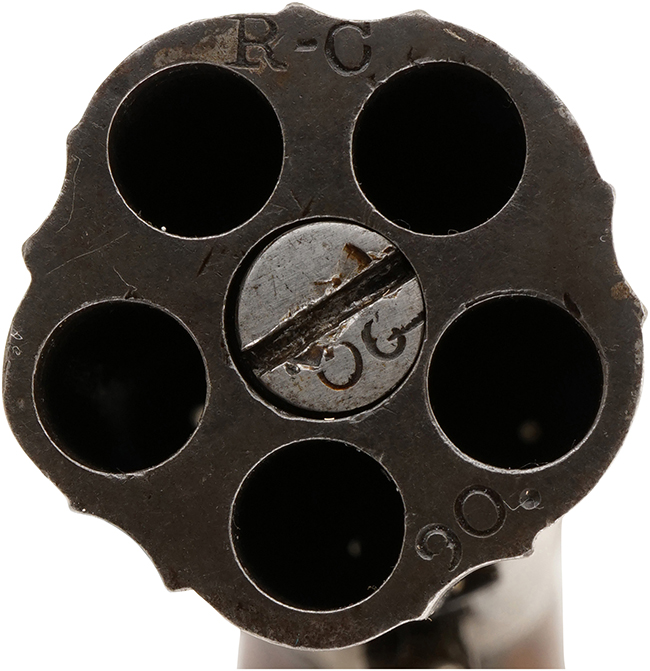 本品は全長14cmにも満たないかなり小型のペッパーボックスで白磨き仕上げになっており、アメリカ風の唐草模様がハッキリと確認できます。 小型ながらしかっりとした造りでサイズ感が判らない画像で観ると大きく感じます。 ハンマーレスのダブルアクションのみで、リング・トリガーを引くとバレルがキチンと回転します。 美しい木製グリップには当時の艶も残っており、古式銃としては良い程度ですが、当たり傷など使用感はあります。 銃口部分に「R-C」の刻印とシリアル No.90が打たれています。 またバレル軸の先端にも同じシリアル No.90が打たれています。