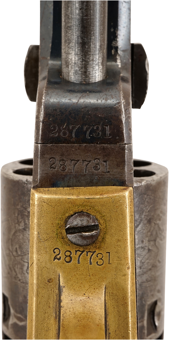 本品はシリアル No.287731から1866年製であることが判ります。 本品の銃身上面のメーカー・アドレス刻印は、最後期の "One Line New York Address" と呼ばれるもので、「ADDRESS COL SAML COLT NEW-YORK U.S. AMERICA」のアドレス刻印が一行で入っています。 One Line New York Address刻印は、1860年から使用され始め、M1849 ポケット リボルバーの生産が終了する1872年 (もしくは1873年) 頃まで用いられました。 コルト M1849 ポケット リボルバーの総生産数約34万挺の内、One Line New York Addressの生産数は約127,000挺で、その内約3,900挺が英国に輸出されたと言われています。