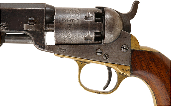 本品のシリアルNo.は、銃身、フレーム、トリガー・ガード、バック・ストラップ、シリンダー、シリンダー軸、バレル・ウェッジが(28)7731でマッチしています。 シリンダー表面の駅馬車 (Stagecoach) 強盗のロール・エングレービングは、やや打ち傷や若干の表面錆は見られるものの、大部分がはっきりと確認出来ます。 また、シリンダーのパテント刻印についても一部薄くなっているものの、概ね残っており、シリアルNo.もはっきりと確認出来ます。 フレームの左側面の「COLTS PATENT」の刻印についても、一部薄くなっていますが、概ね確認出来ます