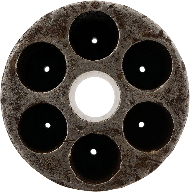 作動については完全で、ハンマーのハーフ/フル・コックはしっかりと掛かり、シリンダーも正常に回転します。 ハンマーのフル・コック位置でトリガーを引くと、ハンマーがスムーズに落ちます。 銃身内は銃口から銃身後部まで完全に抜けて (通って) おり、やや表面錆は見られるものの、ライフリングは比較的はっきりと確認出来ます。 コルト系リボルバーの持病とも言える、銃身とフレームの取り付けのがたつきについては、現状殆ど見られません。 シリンダーは前後にやや遊びが見られますが、あまり気にならないレベルのものです。 ローディング・レバーは左右に僅かに遊びが見られるものの、機能については問題なく、前方に折り畳んだ際のキャッチもしっかりと掛かります。 シリンダーのパーカッション・ニップルはやや時代錆が表れているものの、現状目立った欠けや変形等は見られません。