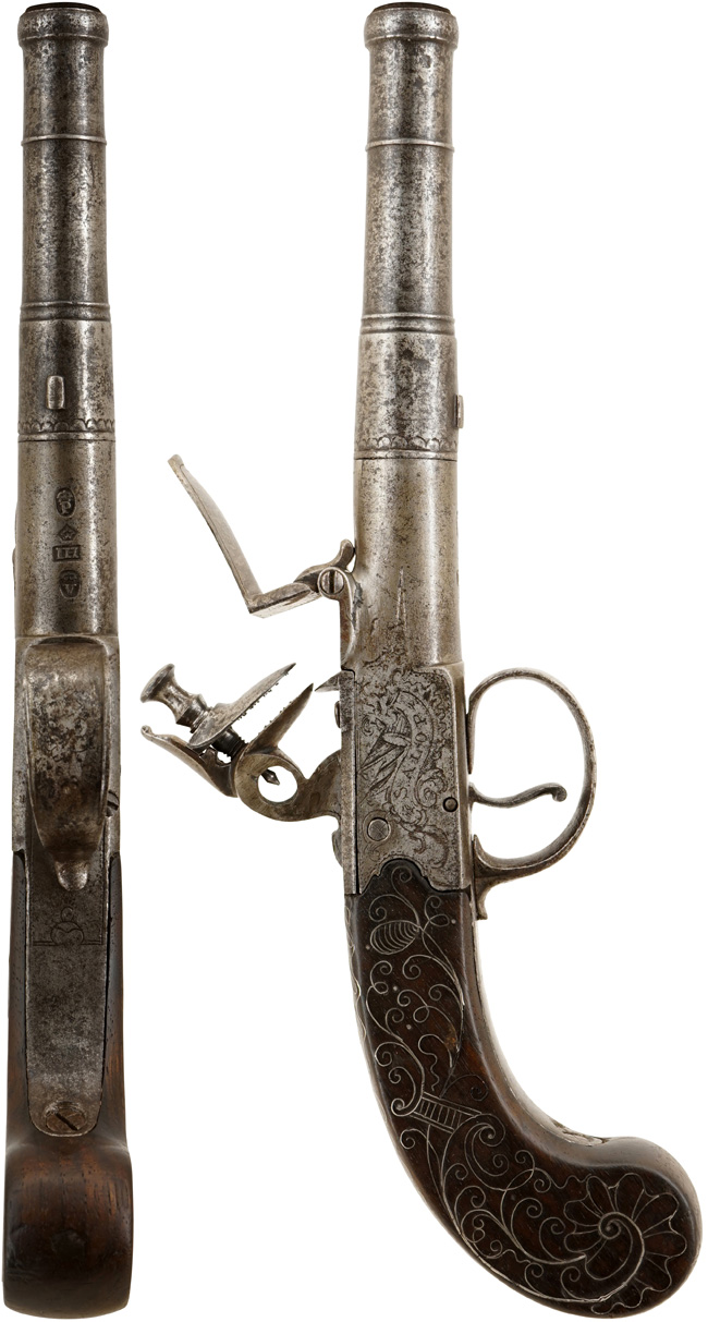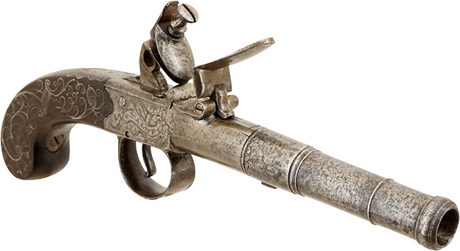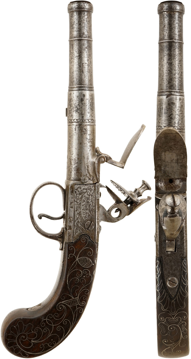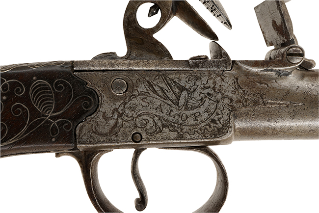 本品はボックス・ロックと呼ばれる本体中央にハンマーがある構造で、全体的なデザインは「ジョージアン・スタイル」と呼ばれる1770年頃に流行した護身用拳銃です。 本品の薬室下部には、Birminghamプルーフ・ハウスが開設された1813年以前に用いられていた、「王冠にP」及び「王冠にV」を組み合わせたプルーフ刻印と「長方形にLH」はバーミンガムにあった"L.Homer"社のメーカー刻印が打刻されています。機関部の両側面に刻まれている「Salop Payton」は販売会社と思われ、"Homer"社がOEM生産した品と想像されます。Salopは現在のShropshireにあるShrewsburyで、同地にあった"Homer"社はBirminghamでガンメーカーとして登録されていた記録が残っており、主に小型のフリントロック・ピストルを製造していました。