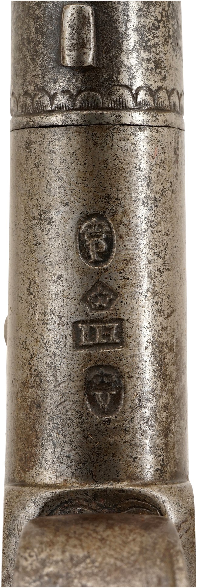 本品の本体右側面には「SALOP」の地名が、本体左側面には「PAYTON」のメーカー(販売店)刻印が彫られています。 銃身や本体、ハンマーといった鉄部については、元々は白磨き仕上げだったものが、経年による褪色やくすみが見られます。 極僅かな打ち傷及び時代錆が見受けられるものの、目立った欠損等は見られず、製造された時代を考慮すれば総じて良好な状態が保たれています。 木製のグリップについても、僅かな打ち傷や線傷は見受けられるものの、現状目立った破損等は見られず、こちらもコンディションは比較的良好です。銀線象嵌の一部が欠損していますが全く気にならない程度です。