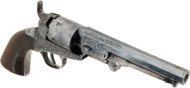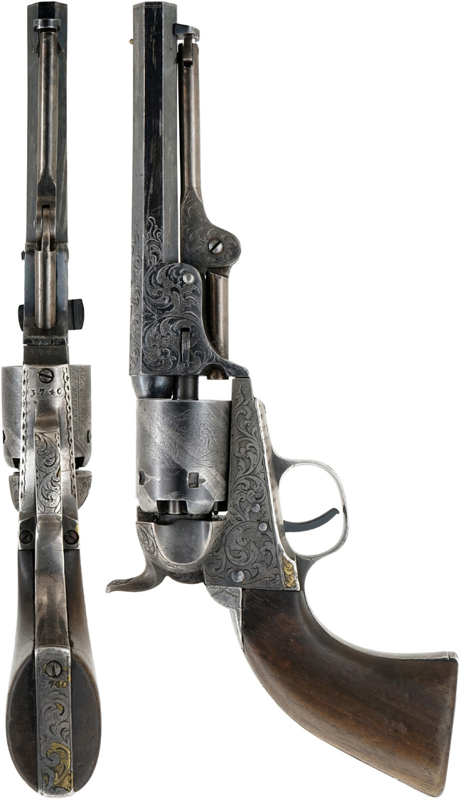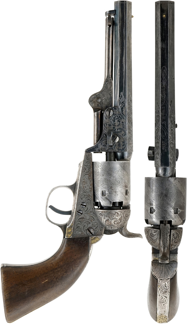 ベルギーでコルトのパテントに基づいて製造された、M1849タイプのポケット リボルバーで、全体的に素晴らしい彫刻が入っており、リボルバーでは非常に珍しいダマスカス模様がハッキリとした出来の良い品です。
