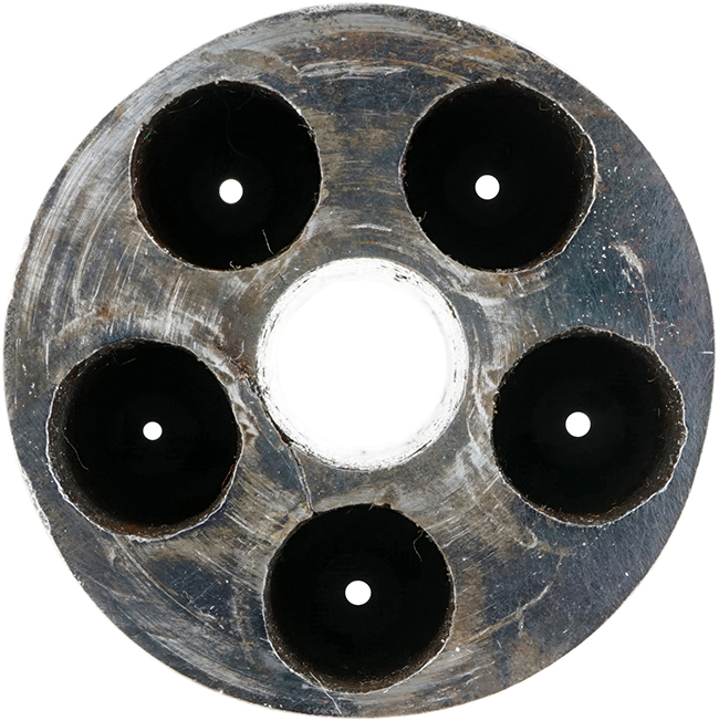 作動については完全で、ハンマーのハーフ/フル・コックはしっかりと掛かり、シリンダーも正常に回転します。 フル・コック位置でトリガーを引くと、ハンマーがスムーズに落ちます。 銃身は銃口から銃身後部まで完全に抜けて (通って) います。 銃身内はやや表面錆が見られますが、ライフリングは確認可能です。 コルト系リボルバーの持病とも言える、銃身とフレームの取り付けのがたつきやシリンダーの前後の遊びについては現状殆ど見られません。 ローディング・レバーの左右の遊びについても少なく、機能についても問題なく、前方に折り畳んだ際のキャッチもしっかりと掛かります。 シリンダーのパーカッション・ニップルには現状目立った欠けや変形等は見られず、良好な状態が保たれています。