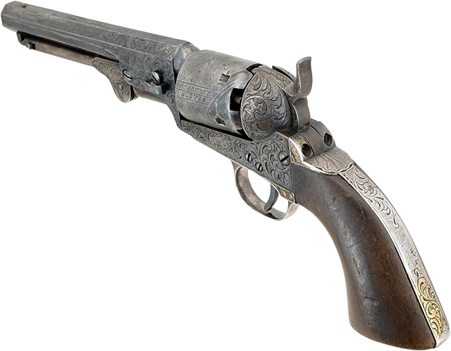 本品はコルト社から正規にライセンスを取得して製造されたコルト M1849タイプのポケット リボルバーで、銃身上面に「COLT BREVETE」のパテント刻印が打刻されている他、フレーム左側面にも「COLT PATENT」の刻印が入っています。 また、銃身上面にはブラックレターと呼ばれる書体で「SamL Colt」の文字が彫られています。 トリガー・ガードは銀鍍金が施された真鍮製で、小型のタイプとなっています。 銃身やフレーム、ローディング・レバー、トリガー・ガード、バック・ストラップといった金属部には、精緻なスクロール・エングレービングが施されています。 また、シリンダーには米国製のM1849 ポケット リボルバーと同様に、駅馬車 (Stagecoach) 強盗のロール・エングレービングが施されています。 尚、本品のシリンダーにはリエージュ・プルーフ・ハウスのプルーフ刻印が打刻されていない事から、コルトのパテントを使用して正規に製造された品ではあるものの、製造後に何らかの理由でプルーフ・ハウスでの検査を受けずに輸出された品であると考えられます。