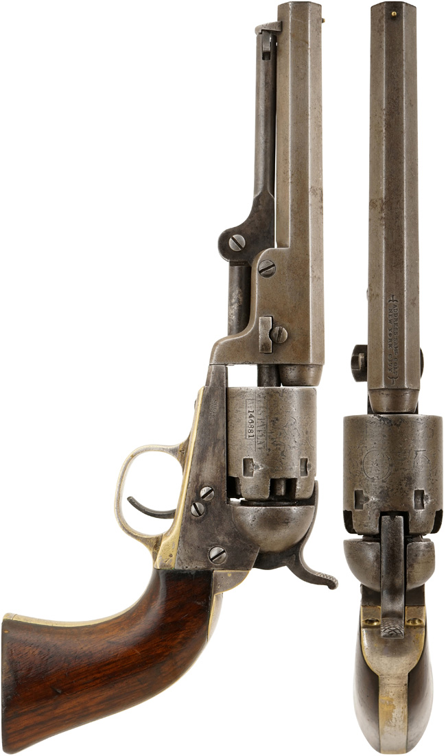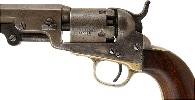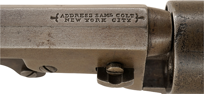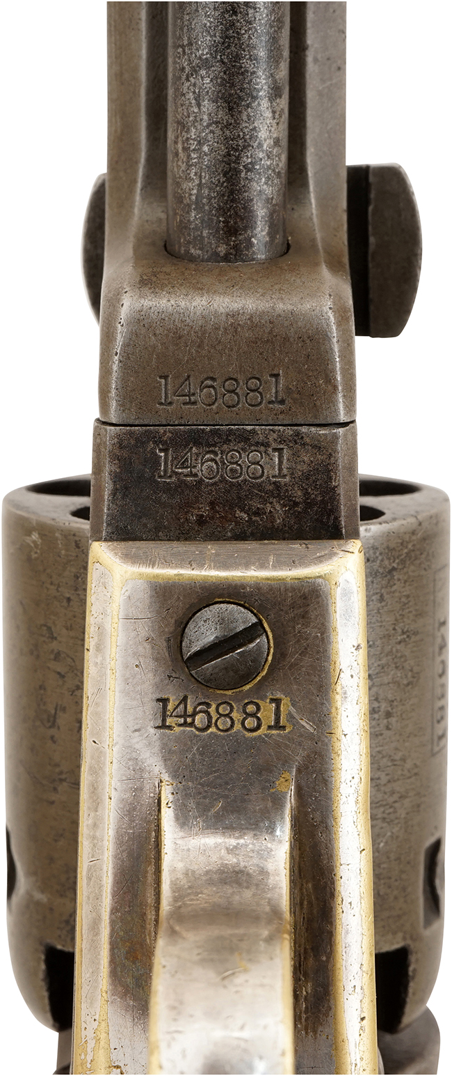 本品はシリアル No.146881から1858年製であることが判ります。 本品の銃身上面のメーカー・アドレス刻印は、初期の "Two Line New York Address" と呼ばれるもので、「ADDRESS SAML COLT NEW YORK CITY」のアドレス刻印が二行にわたって入っています。 Two Line New York Address刻印は、1861年後半頃まで用いられました。 コルト M1849 ポケット リボルバーの総生産数約34万挺の内、Two Line New York Addressの生産数は約156,000挺と言われています。