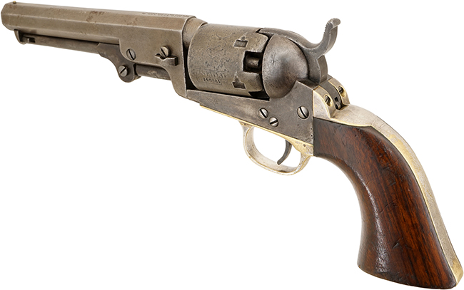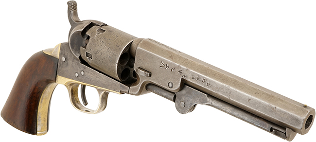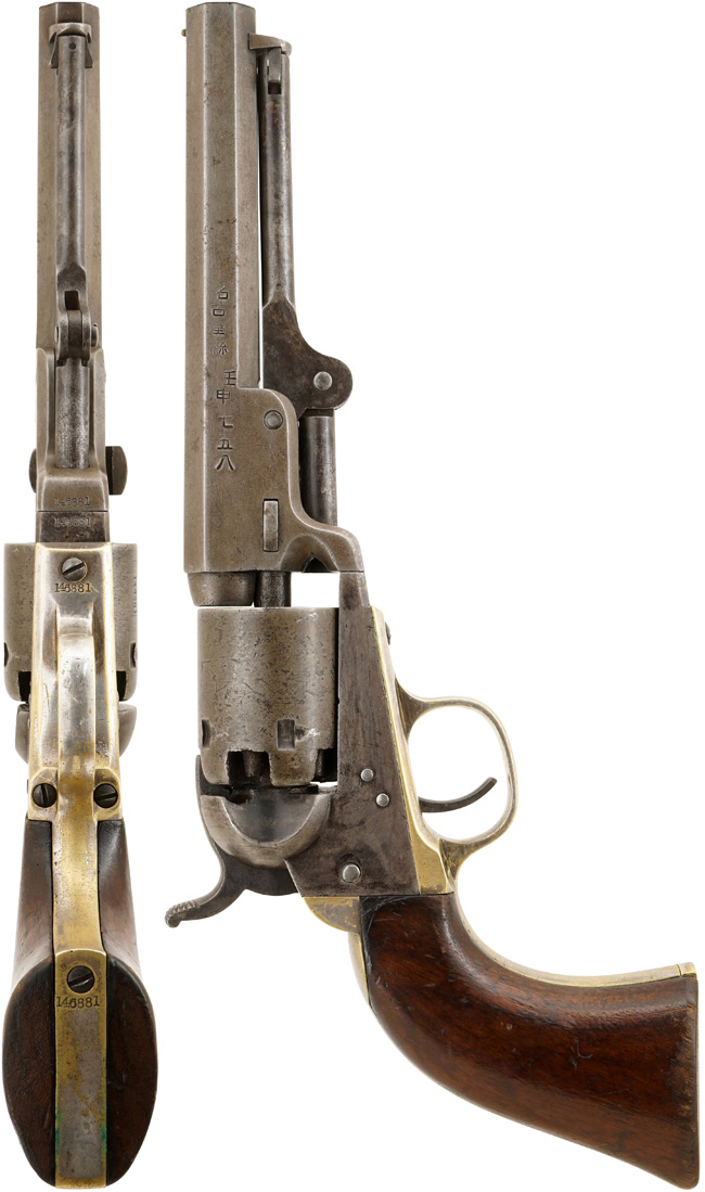 (種別: 管打ち式銃砲、全長: 26.9cm、銃身長:12.6cm、口径0.8cm、銘文: ADDRESS SAML COLT NEW YORK CITY)