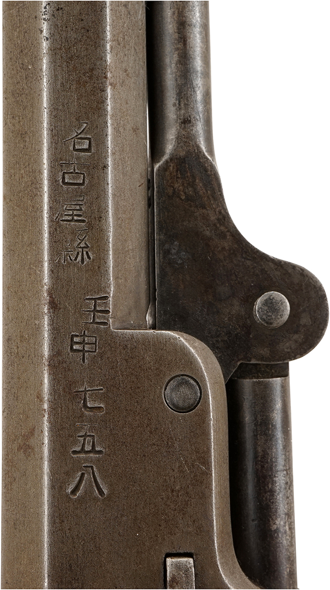 明治4年に明治陸軍は主力小銃の統一化を図る為、旧藩に残る銃砲の種類、挺数の把握が急務となりました。 翌明治5年 (1872年、壬申) 1月から、太政官布告第28号第五則の「銃砲取締規則」によって、私蔵されていた銃砲の「我が国初の管理統制」が始まりました。 廃藩時に旧藩は旧家臣に軍用銃を下付した事例が多く見られ、旧士族の家には一挺の軍用銃があったとも言われています。 それらの銃はその後市中に大量に出回り私蔵されていました。 銃砲取締規則ではこれらの私蔵されていた銃砲について、管轄庁 (東京と大阪は武庫司) に持参して改刻印式によって番号、官印を受ける (これが明治5年度であれば壬申刻印と番号) 事が義務付けられました。 同時に管轄庁は同人名と番号を管轄鎮台に届け出て、鎮台より武庫司にそれらが提出される仕組みになっていました。 この調査は明治20年代頃まで銃砲調査が行われましたが、明治5年 (1872年=壬申) の調査が最も大々的に行われ、今日この種類の刻印の内90-95%が壬申の年に行われた事から、古式銃に打たれた漢字の刻印をまとめて「壬申刻印」と呼ばれています。 本品は「名古屋縣 壬申七五八」の刻印が入っている事から、明治5年に名古屋県に届け出が行われた品である事が判ります。名古屋縣は、現在の愛知県のことです。江戸時代までは尾張国(愛知県西南部)と三河国(愛知県東南部)に分かれていましたが、1871年の廃藩置県で名古屋縣として統合されました. 1876年に愛知縣と改名され、現在の愛知県の形となりました。