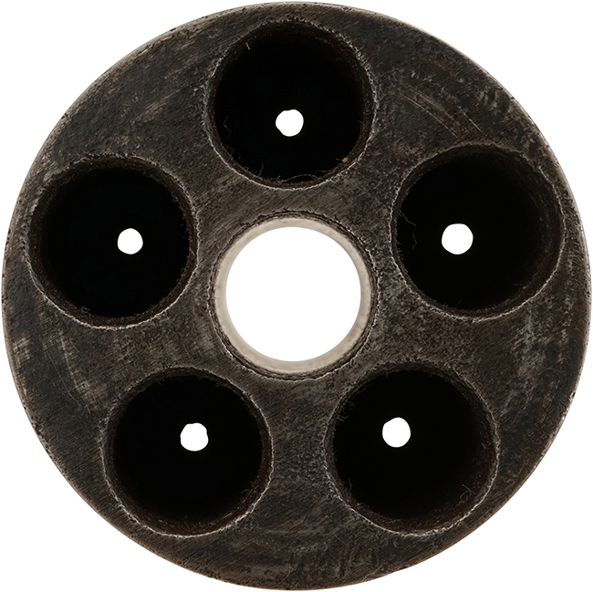 作動については完全で、ハンマーのハーフ/フル・コックはしっかりと掛かり、シリンダーも正常に回転します。 フル・コック位置でトリガーを引くと、ハンマーがスムーズに落ちます。 コルト系リボルバーの持病とも言える銃身とフレームのがたつきについては現状殆ど見られず、シリンダーの前後の遊びについても少なくなっています。 ローディング・レバーは左右にやや遊びが見られるものの、機能については正常で、前方に折り畳んだ際のキャッチもしっかりと掛かります。 銃身内は銃口から銃身後部まで完全に抜けて (通って) おり、やや表面錆は見られるものの、ライフリングは比較的はっきりと確認出来ます。 シリンダーのパーカッション・ニップルについては、若干の変形や僅かな欠けは見られるものの、概ねしっかりとした状態が保たれています。