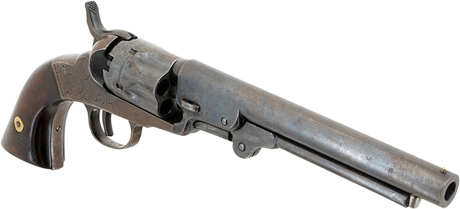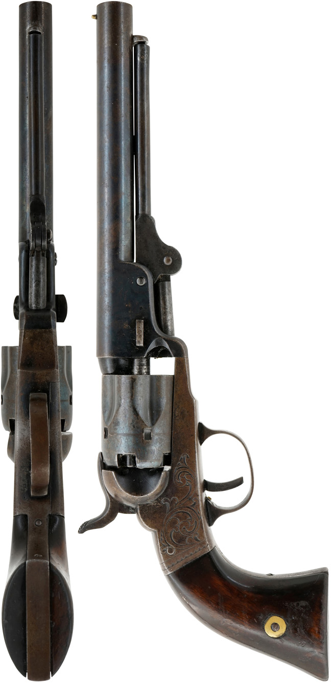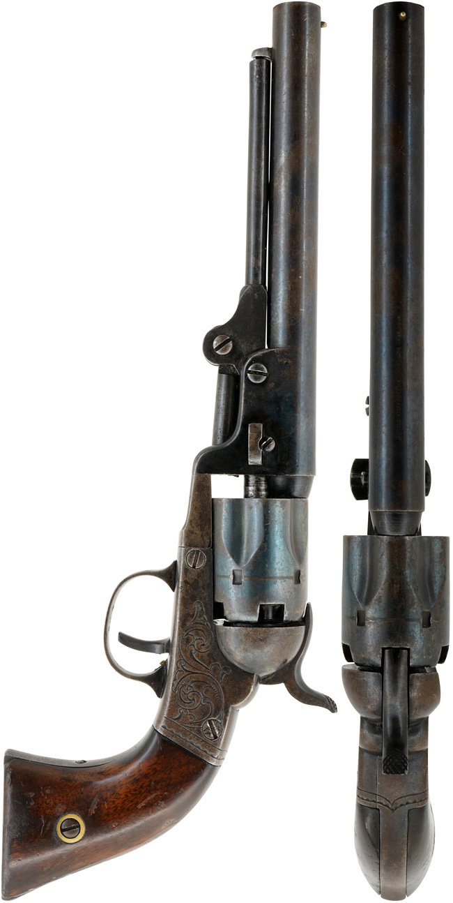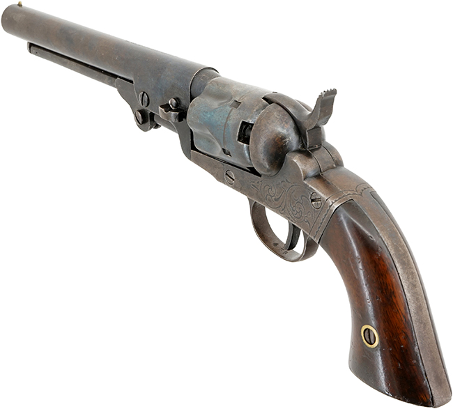 本品は1862年頃に製造された品であると思われます。南北戦争(1861年-1865年)時に将校の自衛用として使用された可能性は十分に考えられます。 銃身やフレームの一部にオリジナルのブルー仕上げが残ったオリジナルの状態です。銃身の上部にBACON MFG. CO. NORWICH CONN.と一行で刻まれており、ほぼ完全に判読はできます。 銃身が丸型(ラウンド)、シリンダーの前半分に溝(フルーティッド)が丸型あるハーフ・フルーティッド ・シリンダーの特徴から、モデル II (セカンド・モデル)である事が判ります。マンハッタン社ポケットと外観上の相違はシリンダー・ストップの数が10個ではなく、各チャンバーにストップが1個ずつある合計5個になっている点です。 セカンド・モデルのラウンド・バレルとハーフ・フルーティド・シリンダーの特徴は、マンハッタン社のポケット リボルバーには無い仕様ですので、マンハッタン社とベーコン社のリボルバーを一丁ずつコレクションするとすれば、このセカンド・モデルが最適です。